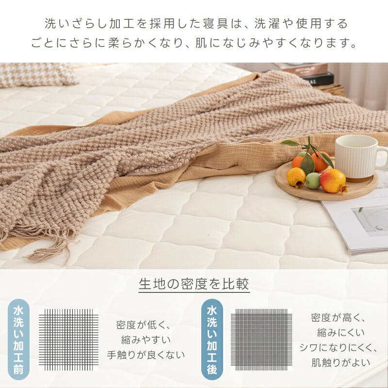 肌に触れる表生地にはピーチスキン加工でしっとりとした風合い。さらに、洗いざらし加工をすることでやわらかな手触りとなっています。抗菌・防臭・防ダニ加工。丸洗いOKです。