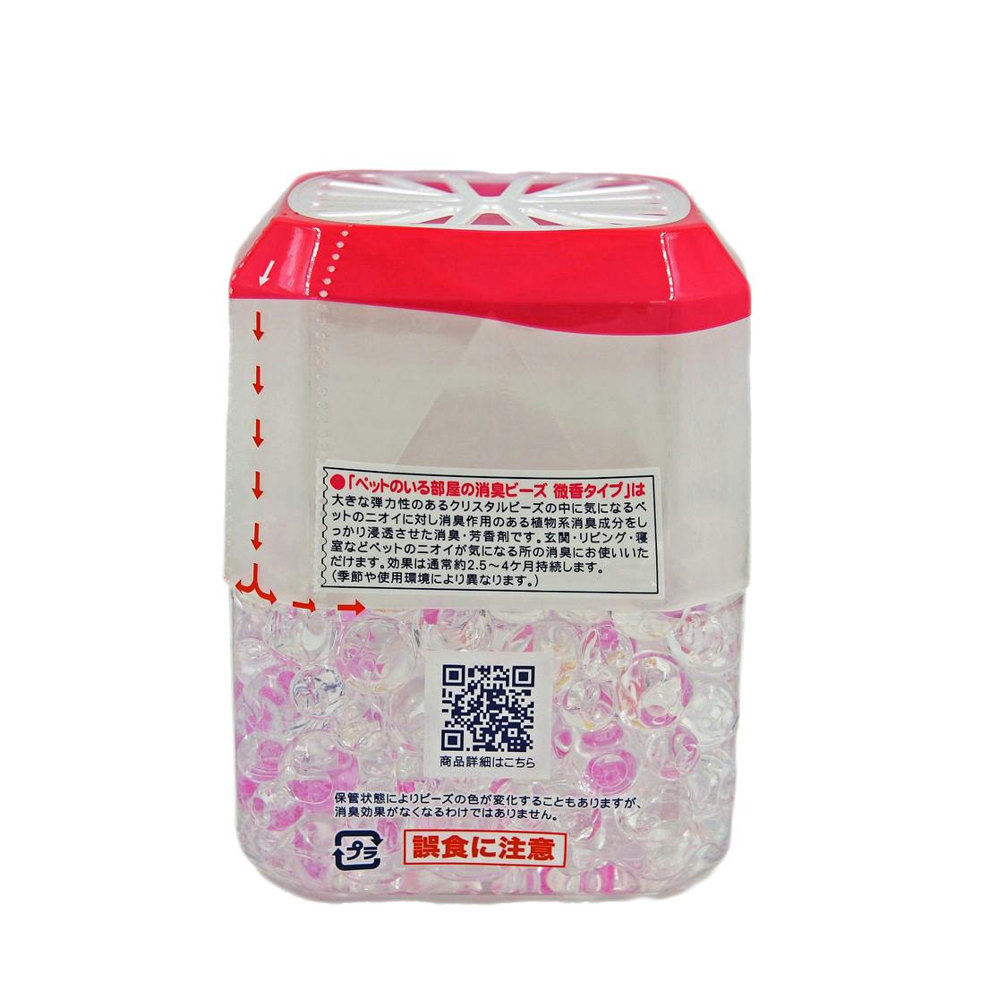 大きな弾力性のあるクリスタルビーズの中に気になるペットのニオイに対し消臭作用のある植物系消臭成分をしっかり浸透させた消臭剤です。玄関・リビング・寝室などペットのニオイが気になる所の消臭にお使いいただけます。効果は通常約2.5~4ヶ月持続します。(季節や使用環境により異なります)。微香タイプ。シャボンの香り。