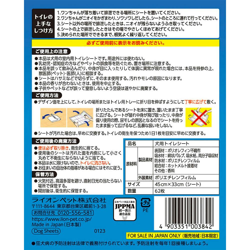 本品は犬用の室内用トイレシートです。用途外には使わない。乳幼児・認知症の方などやペットの誤食等を防ぐため、置き場所に注意する。本品を誤って飲み込んだり、中身が目に入ったりして体調に異常が現れた場合には、本品を持参の上、獣医師(ペット)・医師(人)に相談する。シートはハサミなどで切らずに、そのまま使用する。汚れやモレの原因になります。本品の香りが合わないときは、使用を中止する。子供やペットなどが誤って窒息しないよう空袋は速やかに廃棄する。