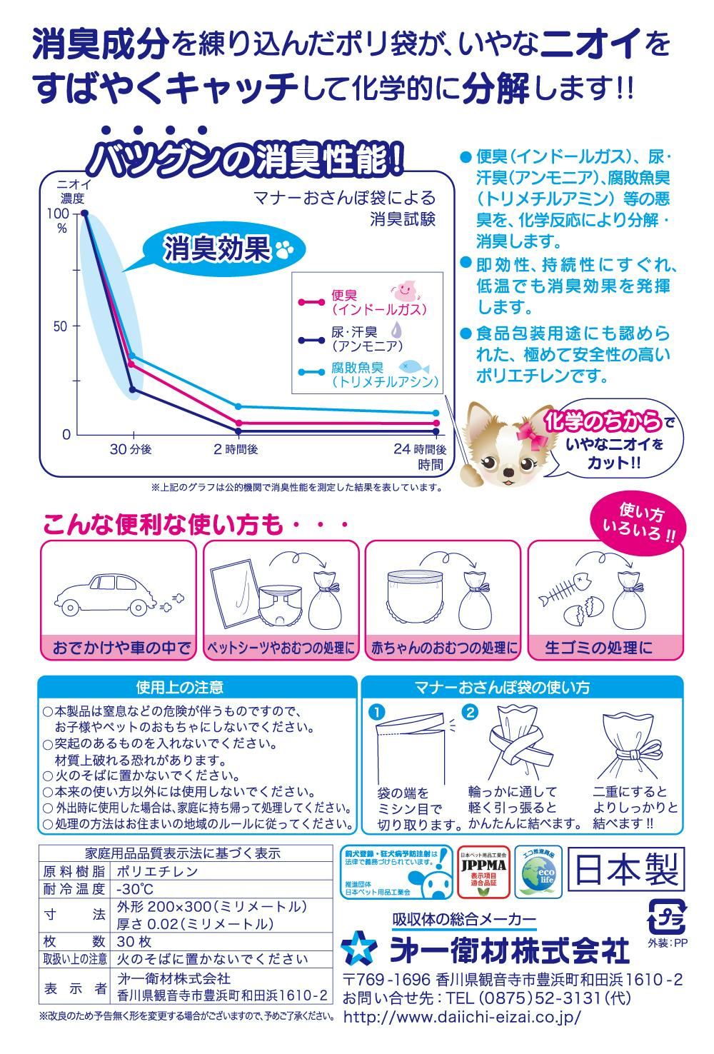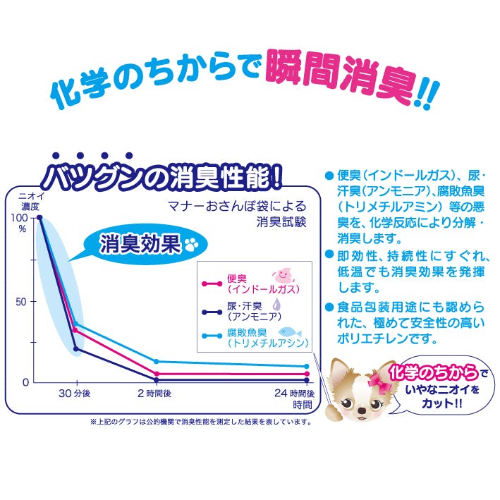 1枚当たりの大きさ:20×30cm。便臭(インドールガス)、尿・汗臭(アンモニア)、腐敗魚臭(トリメチルアミン)等の悪臭を化学反応により分解・消臭します。袋上部のミシン目に沿って端を切り取り、それを用いて袋を縛れば、複数回袋を開けられます。