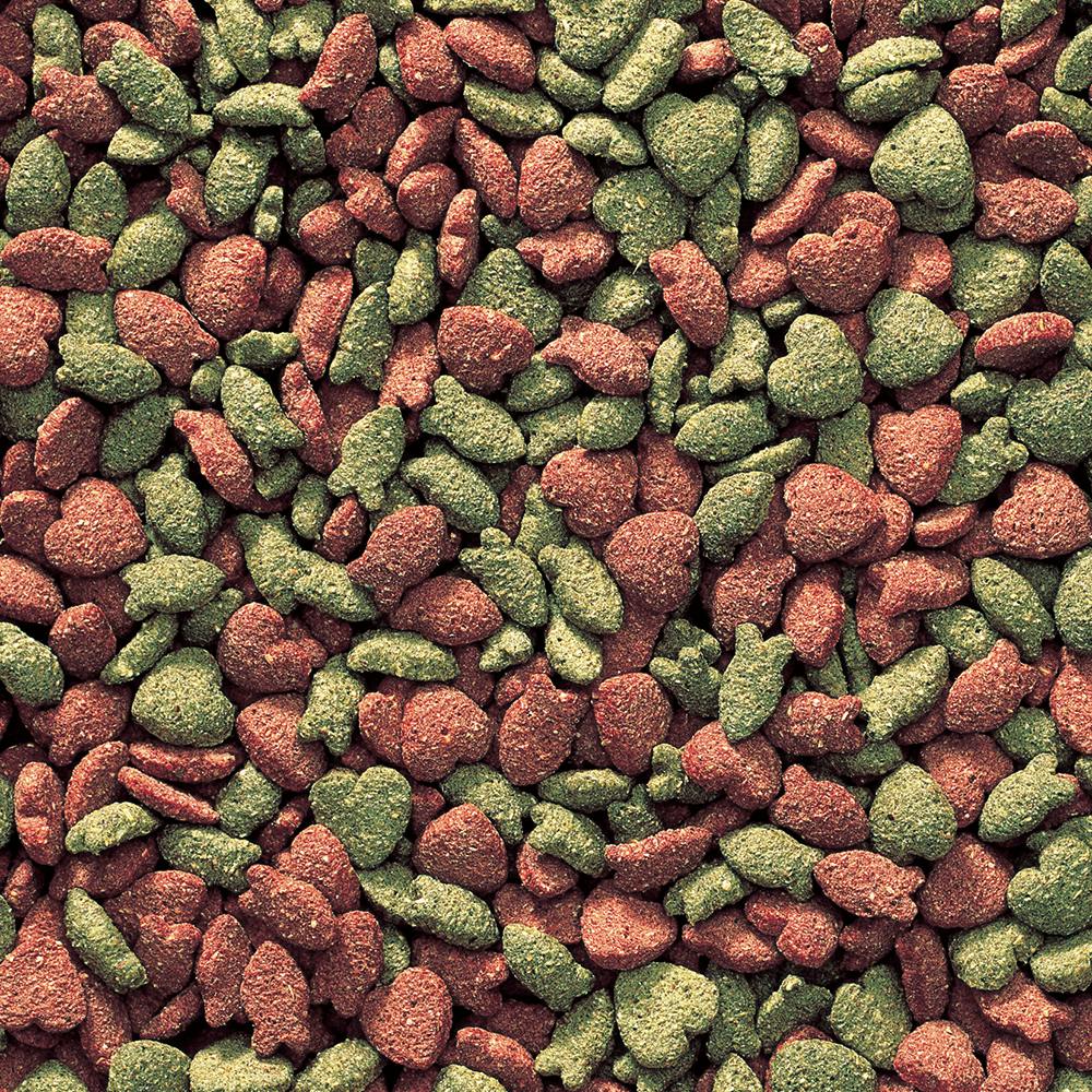 とうもろこし、小麦粉、脱脂大豆粕、アルファルファミール、小麦ふすま、チキンミール、魚粉、動物性油脂、植物性油脂、穀物発酵エキス、ミネラル類(炭酸カルシウム、塩化ナトリウム、第二リン酸カルシウム、硫酸亜鉛、硫酸銅、ヨウ素酸カルシウム)、ビタミン類(A、B1、B2、B3、B6、B12、D3、E、K、D-パントテン酸カルシウム、葉酸)、甘味料(ステビア抽出物)、着色料(黄4、黄5、赤106、赤2、青1)