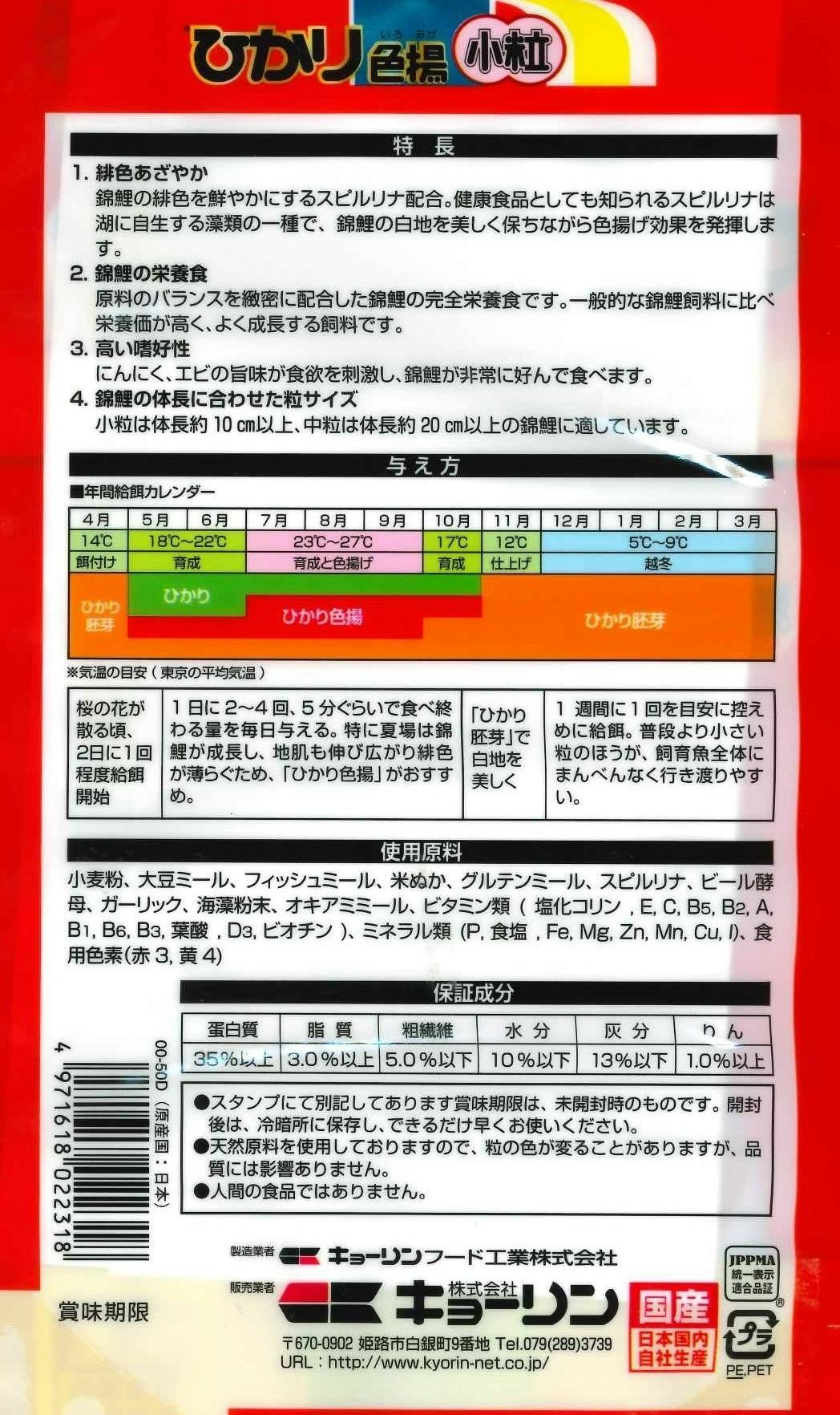 原材料: 小麦粉、大豆ミール、フィッシュミール、米ぬか、グルテンミール、スピルリナ、ビール酵母、ガーリック、海藻粉末、オキアミミール、ビタミン類(塩化コリン、E、C、B5、B2、A、B1、B6、B3、葉酸、D3、ビオチン)、ミネラル類(P、食塩、Fe、Mg、Zn、Mn、Cu、I)、食用色素(赤3、黄4) 原産国:日本
