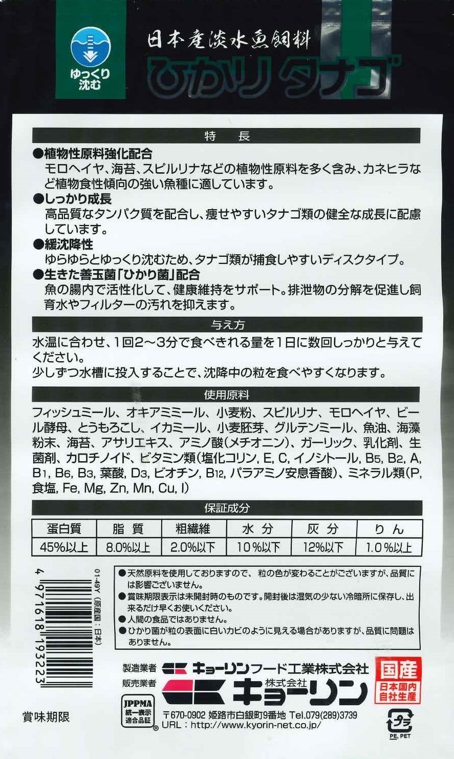 植物性原料強化配合、タナゴ類の健全な成長に配慮します。ひかり菌が腸内で活性化、健康をサポートします。