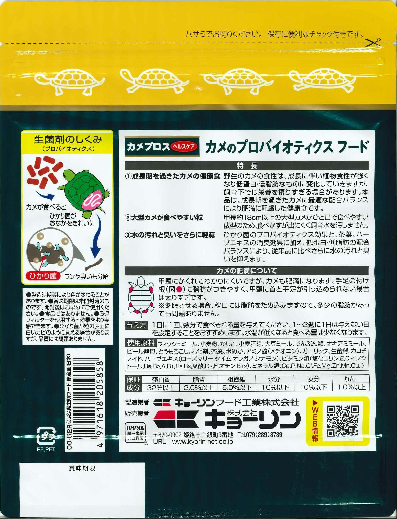 成長期を過ぎたカメに配慮した健康食。食べ易い粒サイズで食べかすが出にくい。ひかり菌配合で水汚れも抑制