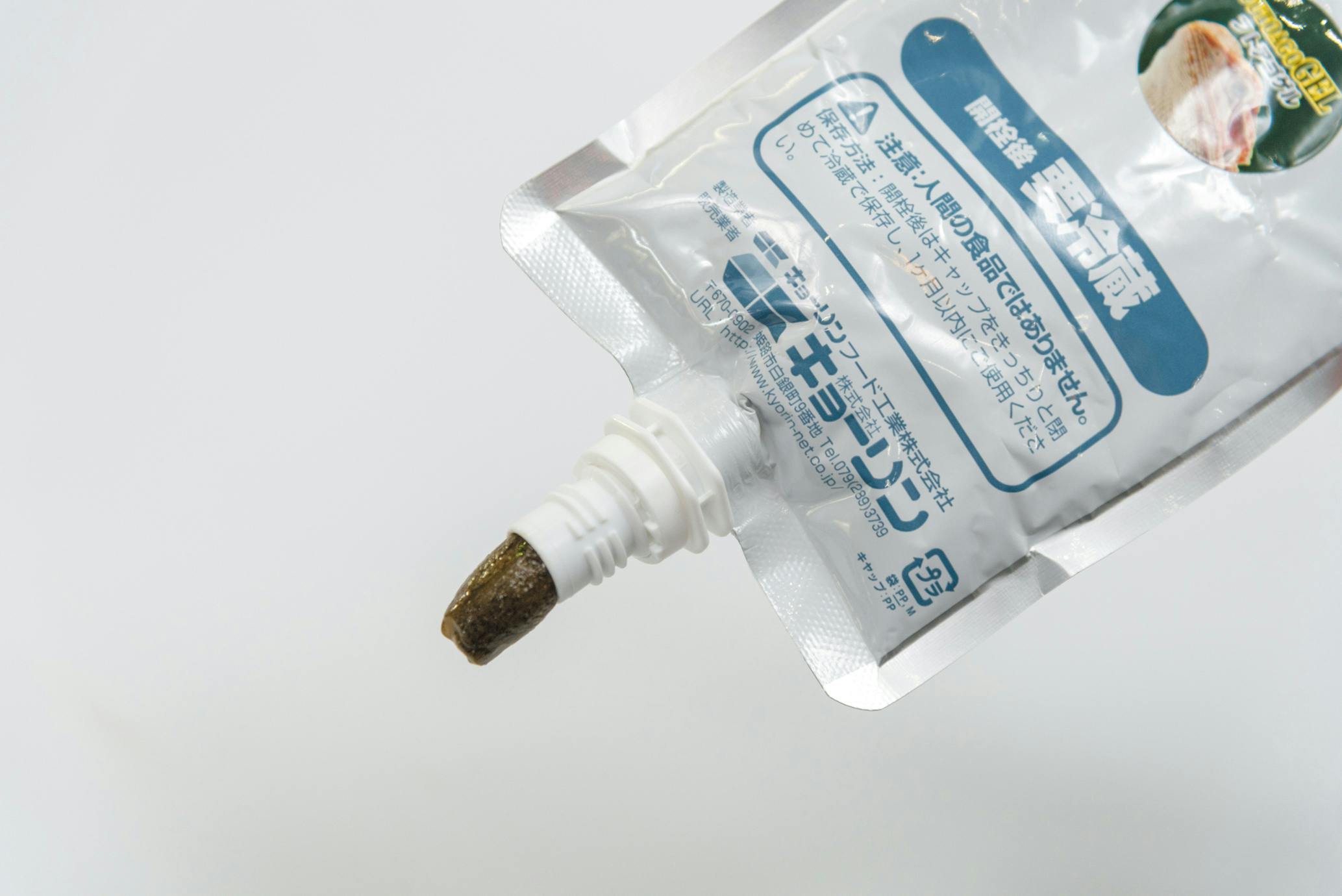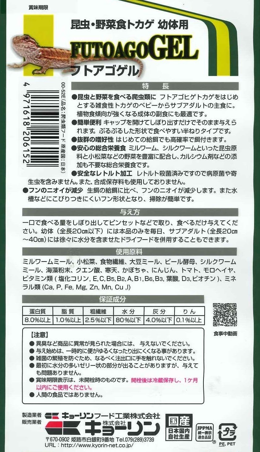 原材料: ミルワームミール、小松菜、食物繊維、大豆ミール、ビール酵母、シルクワームミール、海藻粉末、クエン酸、寒天、かぼちゃ、トマト、にんじん、モロヘイヤ、ビタミン類(塩化コリン、E、C、B5、B2、A、B1、B6、B3、葉酸、D3、ビオチン)、ミネラル類(Ca、P、Fe、Mg、Zn、Mn、Cu、I) 原産国:日本