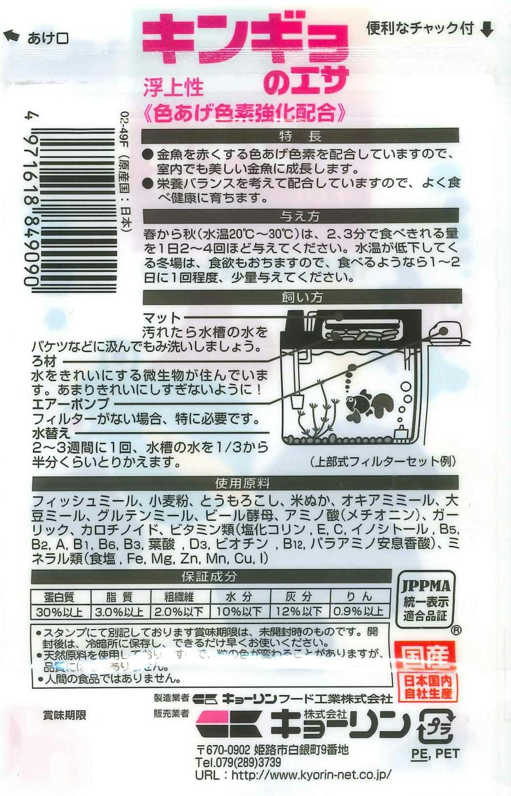 原材料: フィッシュミール、小麦粉、とうもろこし、米ぬか、オキアミミール、大豆ミール、グルテンミール、ビール酵母、アミノ酸(メチオニン)、ガーリック、カロチノイド、ビタミン類(塩化コリン,E,C,イノシトール,B5,B2,A,B1,B6,B3,葉酸,D3,ビオチン,B12、パラアミノ安息香酸)、ミネラル類(食塩,Fe,Mg,Zn,Mn,Cu,I) 原産国:日本