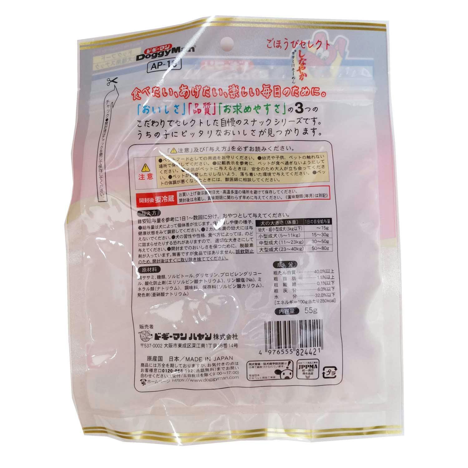 鶏ササミ、糖類、ソルビトール、グリセリン、プロピレングリコール、酸化防止剤(エリソルビン酸ナトリウム)、リン酸塩(Na)、ミネラル類(ナトリウム)、調味料、保存料(ソルビン酸カリウム)、発色剤(亜硝酸ナトリウム)