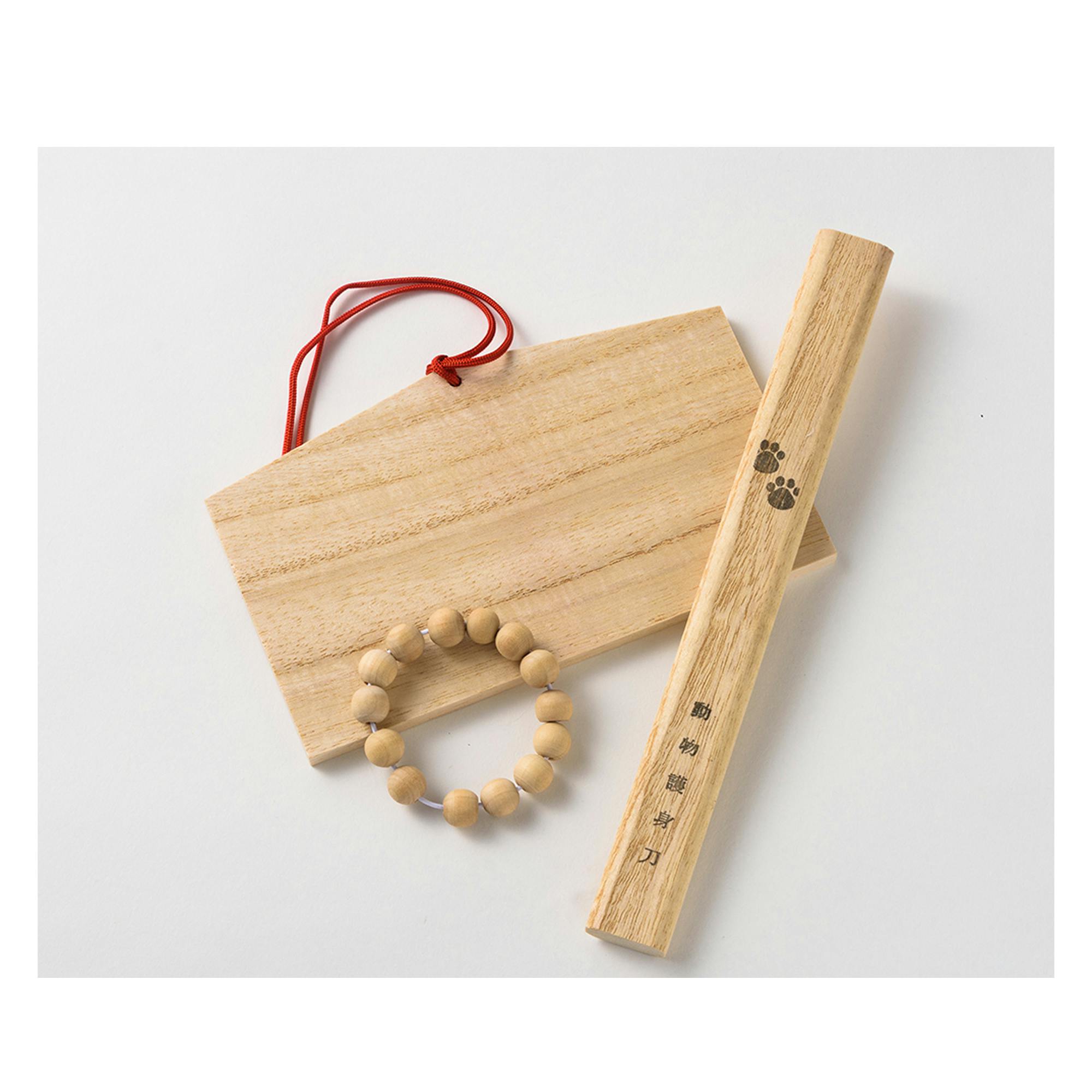 絵馬の形のメッセージボード。 お手紙の代わりに、感謝の言葉や絵などを思い思いに書くことができます。 守り刀 大切な家族だから、人と同じように葬儀してあげたい。木製の模造刀です。 数珠 糸がゴム製なので様々な大きさのペットに握らせることができます。   各種サイズ 【数珠】直径約5cm 球1粒0.8cm 【絵馬】幅約14.5×高さ9x厚さ0.6cm 【守り刀】長さ20×幅2x厚さ0.8cm