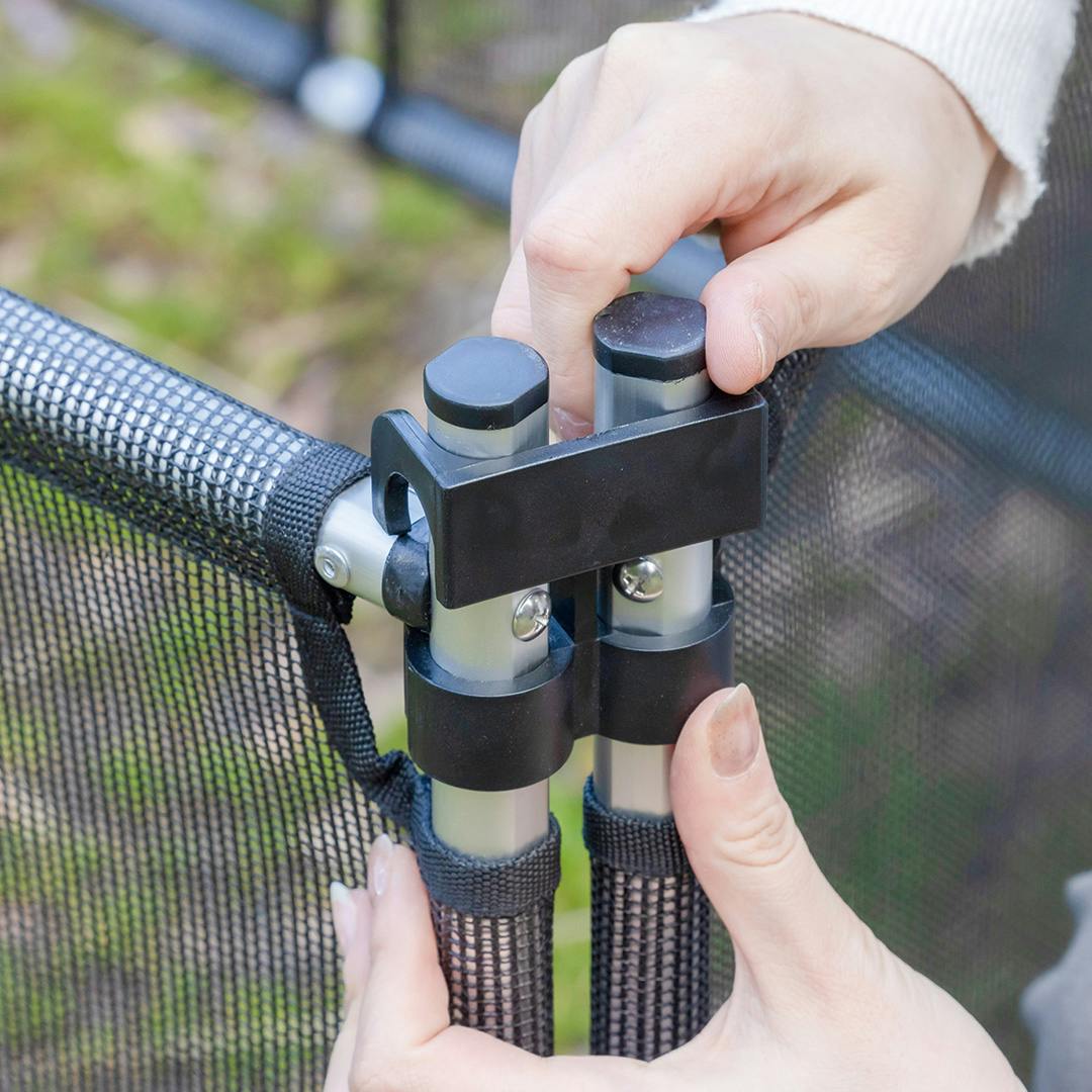 アルミ製で軽量なので、ペットと一緒のお出かけやアウトドア・キャンプに最適。様々な形に組み換え可能です。災害時にも空き地などのスペースを利用してワンちゃんのストレス発散にもご使用いただけます。パネルの上下にクランプをつけて連結し、地面にペグで固定して設置するので、ワンちゃんが寄りかかっても頑丈で倒れません。