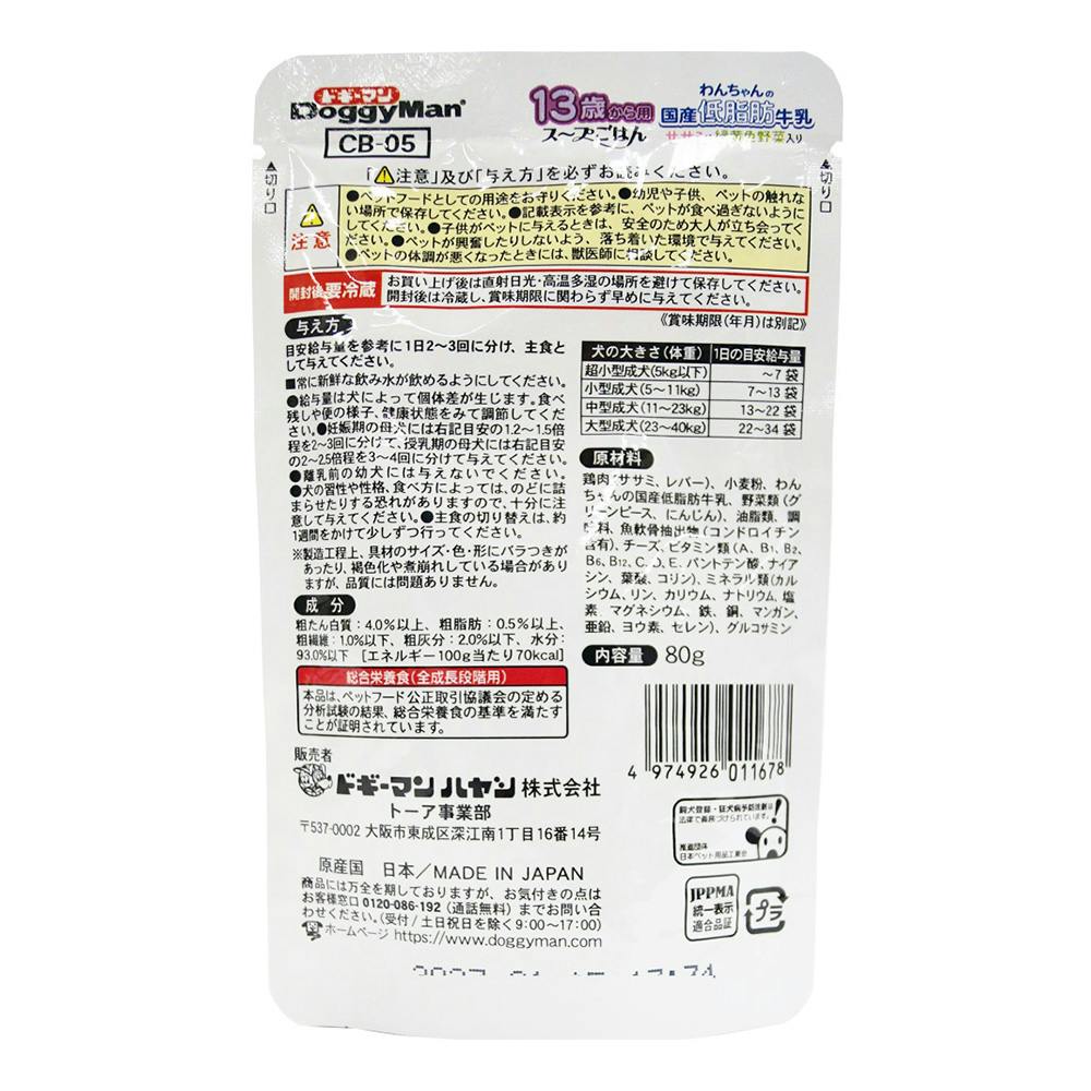 • 【ケース販売】13歳から用わんちゃんの国産低脂肪牛乳 スープごはんササミと緑黄色野菜入り80g(1ケース60個入り) 総合栄養食 トッピング 4970096931655【別送品】