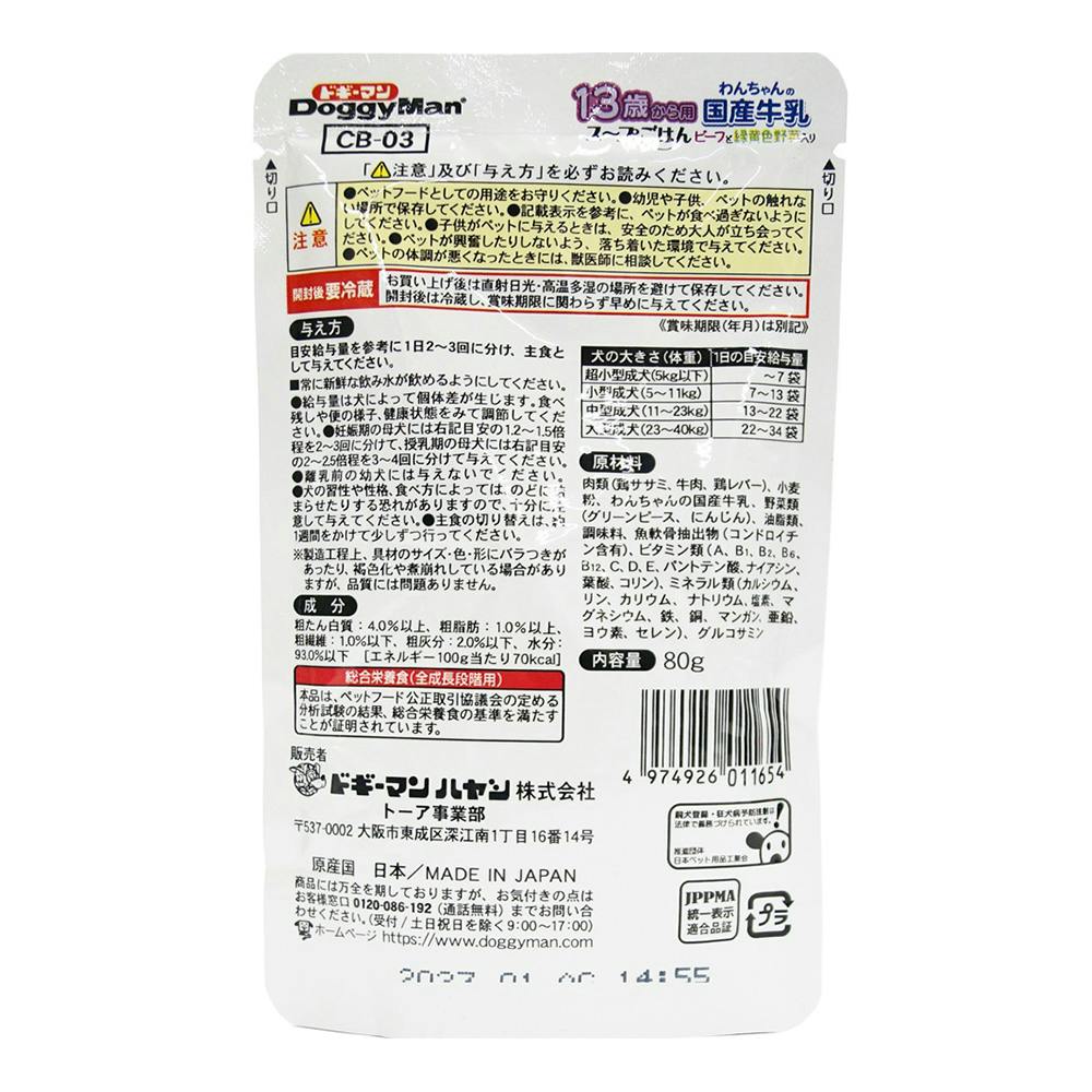 【ケース販売】13歳から用わんちゃんの国産牛乳 スープごはんビーフと緑黄色野菜入り80g(1ケース60個入り) 総合栄養食 トッピング 4970096931662【別送品】