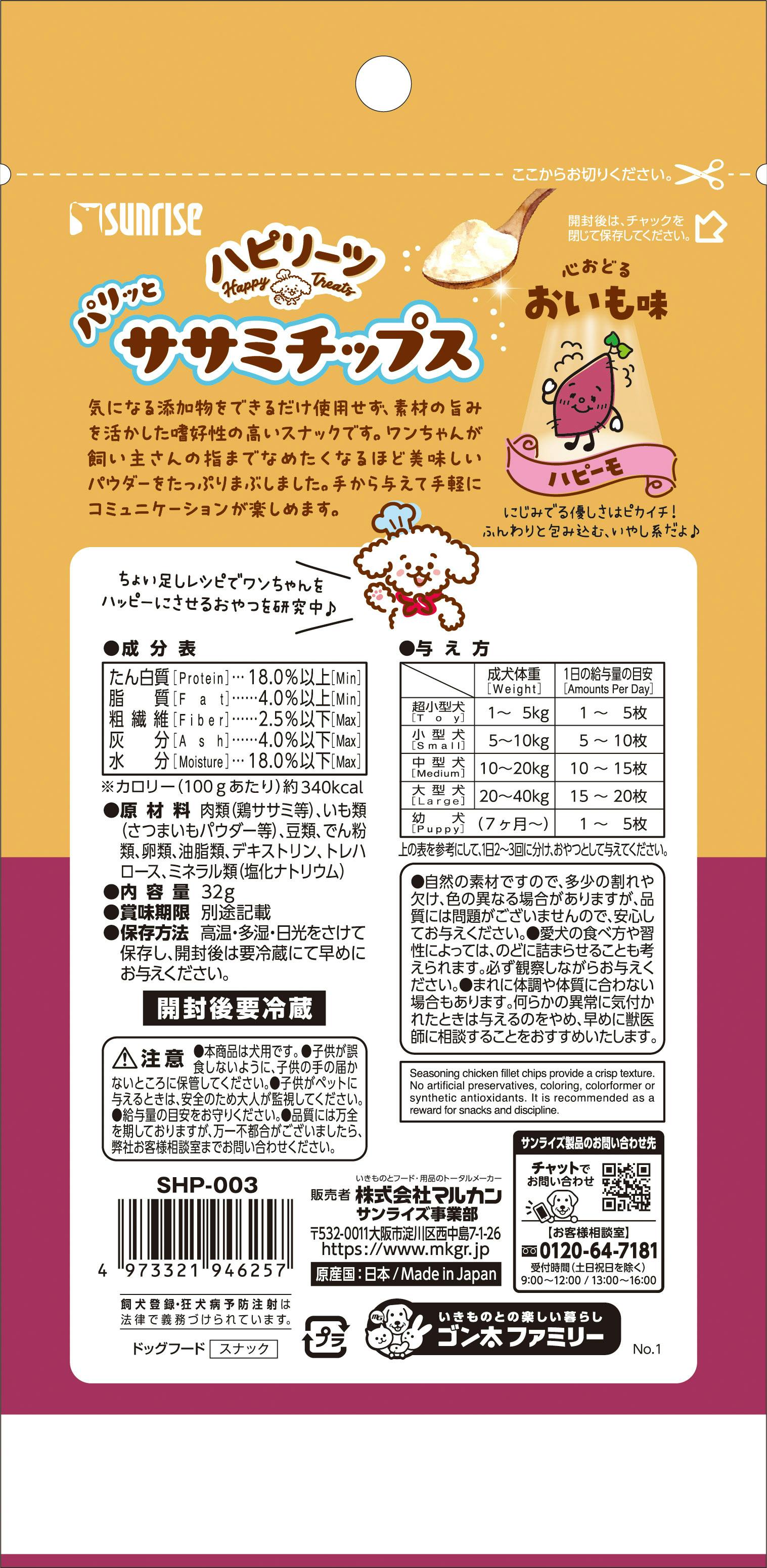 サンライズハピリーツパリッとササミチップスおいも味32g ご褒美用 4973321946257【別送品】
