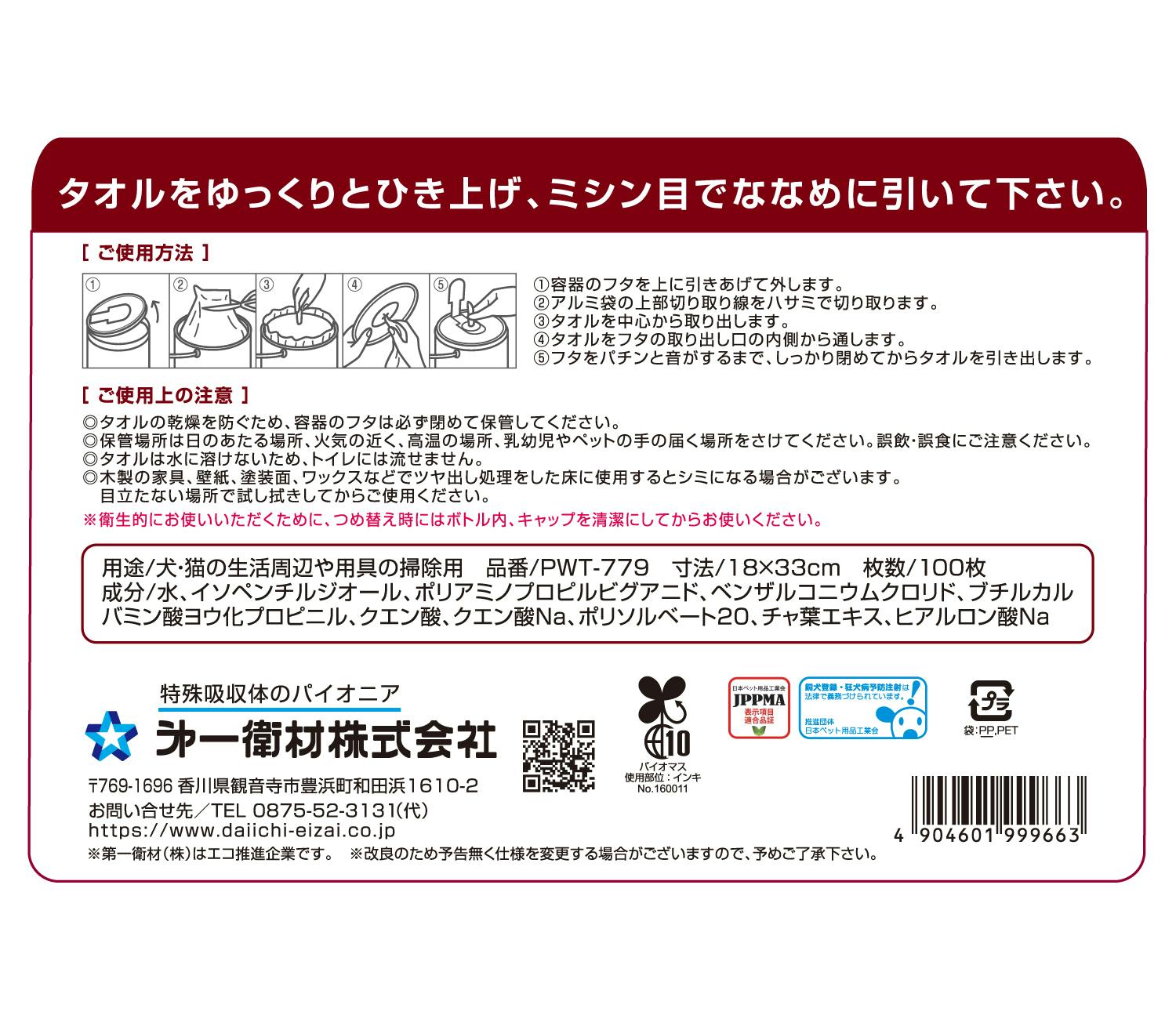 シートが取り出しやすいバケツ型ウェットタオルです。18×33cmで大きめなので使いやすいです。ペット用品の拭き掃除や床そうじにも便利。アルコール、パラベン、PG不使用なので、なめても安心!