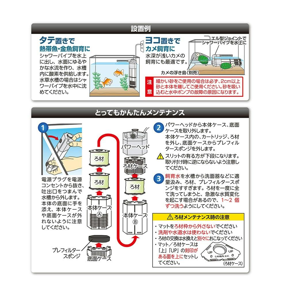 ●使用の前に必ず付属の説明書をよく読み、正しくセットしてください。●適合水槽・水量を守って使用する事。●魚の量、水槽の設置場所、水質等諸条件により効果に差が出る事がある。●魚病薬を使用する際は活性炭カートリッジを外す事。