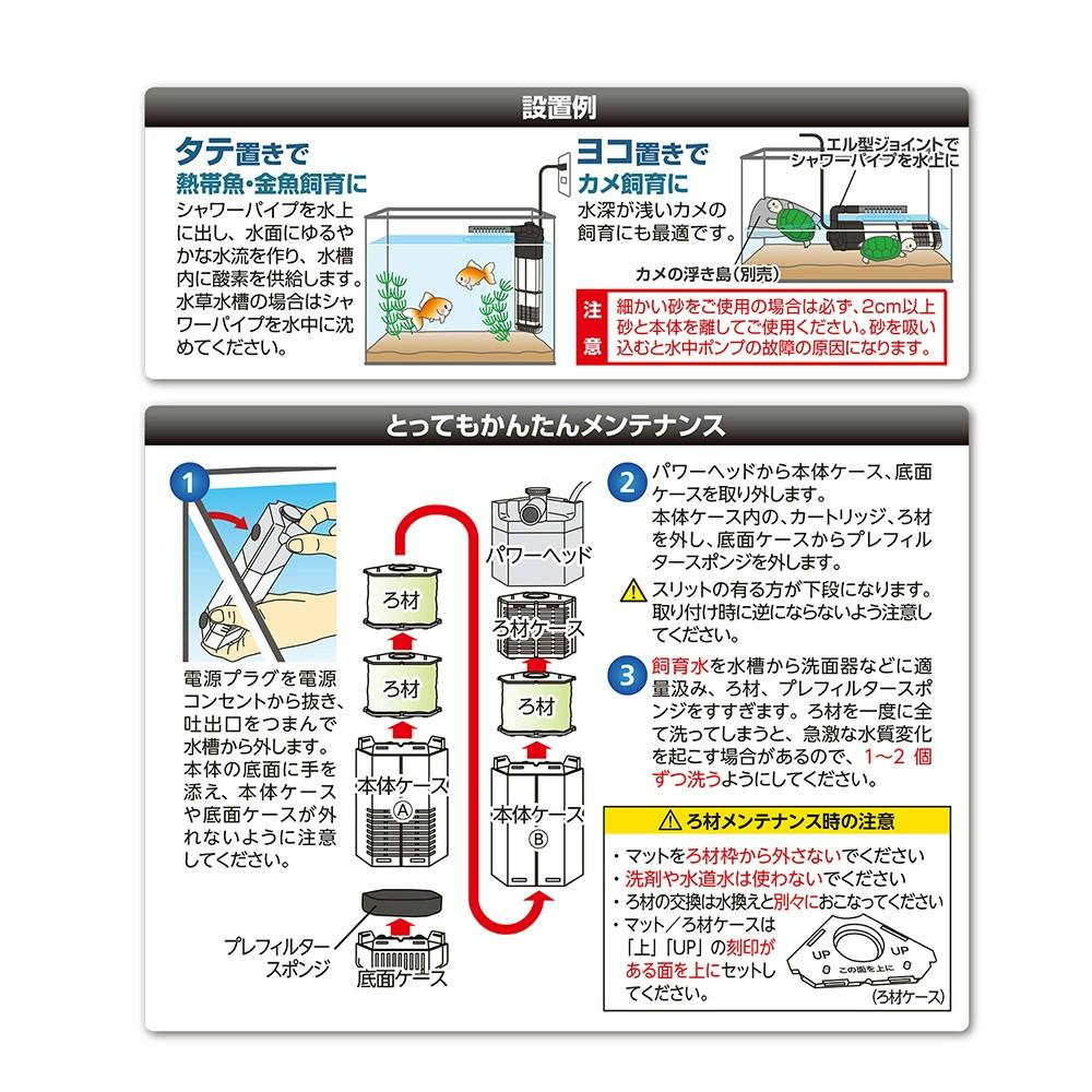 ●使用の前に必ず付属の説明書をよく読み、正しくセットしてください。●適合水槽・水量を守って使用する事。●魚の量、水槽の設置場所、水質等諸条件により効果に差が出る事がある。●魚病薬を使用する際は活性炭カートリッジを外す事。