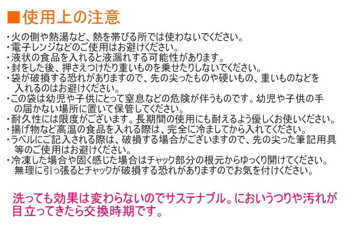 電子レンジは使用できません。液状の食品は液漏れする場合があります。環境、食品の種類、個体差等により保持力に差が生じることがあります。食品の種類によっては向き不向きがあります。耐久性には限度がございます。においうつりや汚れが目立ってきたら交換してください。