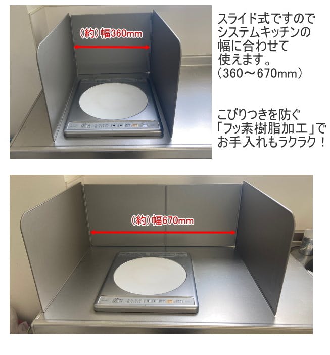 調理中のハネ汁・油ハネをがっちりキャッチできるシステムキッチン用のレンジガードです。スチール鋼製で、従来のアルミ箔製品に比べ耐久性に優れています。こびりつきを防ぐ「フッ素樹脂加工」でお手入れもラクラク!スライド式でコンロの幅に合わせて使えます。コンロ回りをきっちりガード出来るワイドサイズです。システムキッチン用:コンロの上に置くタイプです。
