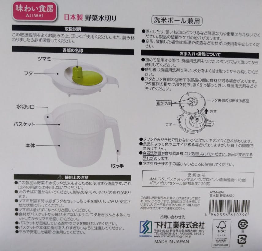 下村工業 味わい食房 野菜水切り AYM-694 日本製 水切り 野菜 葉物 レタス サラダ コンパクト 便利 手軽 下ごしらえ 調理 料理 洗米 米とぎ 4962336610390【別送品】