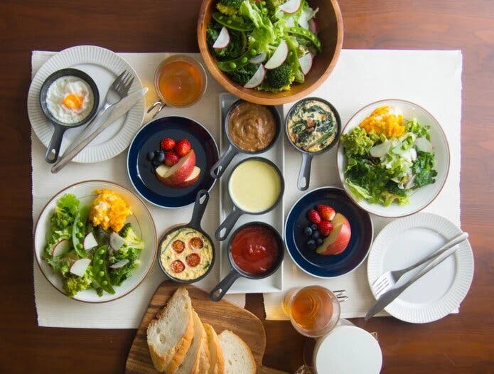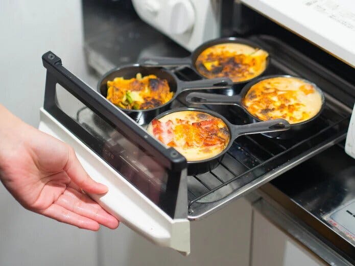 プチスキレットは魚焼きグリルに4個入るサイズ感。オーブン、トースター、魚焼きグリルと調理方法はいろいろ!プチサイズの料理をたくさん用意して、見た目も華やか!パーティーで大活躍!※電子レンジでは使用できません。