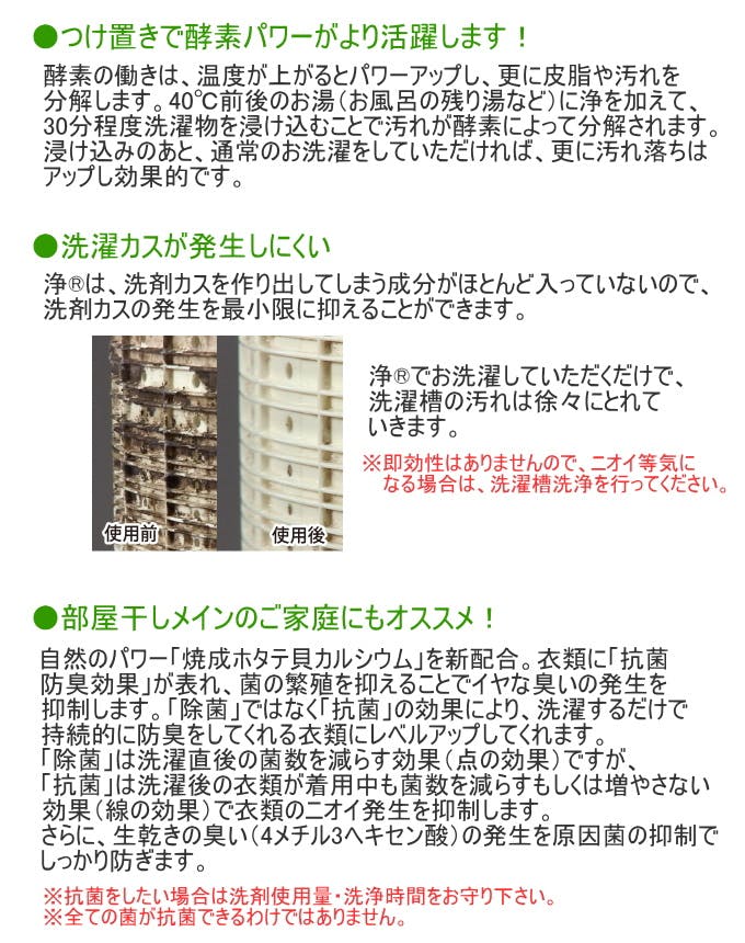 ●天然由来成分「焼成ホタテ貝カルシウム」を配合。●洗浄主成分である界面活性剤の配合を大幅カット●優れた再汚染防止性能と洗浄力。●衣類に付いた汚れを落としやすくする「汚れリリース」機能●スピードコース対応でお洗濯の時間短縮。●靴下のニオイ臭「イソ吉草酸」を大幅に抑制。●「スーパートリプル酵素」配合。