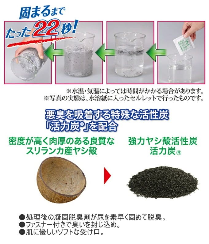 レジャーや災害時にも便利な携帯トイレ。オシッコをサッと固めてスッと消臭!処理袋の凝固脱臭剤が尿を素早く固めて脱臭。ファスナー付きで臭いをしっかり封じ込めます。肌に優しいソフトな受け口。男女兼用でお使いいただけます。コンパクトで衛生的な個装タイプ。【サイズ】(約)幅13.5×高さ28.5cm(受け口含まず)【最大吸収量】(約)420cc【入数】5個入