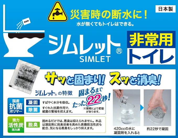衛生的で簡単!災害時、緊急時など水が使えないときに大活躍!非常時の必需品!備えあれば憂いなしです。(大便にも、袋を破き直接ふりかけて下さい。)※保管可能期間は未開封で約10年です。
