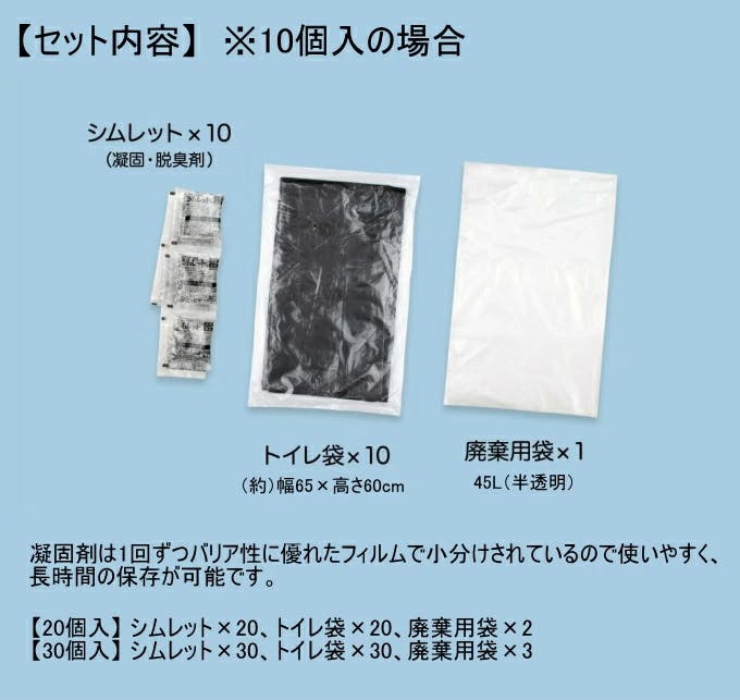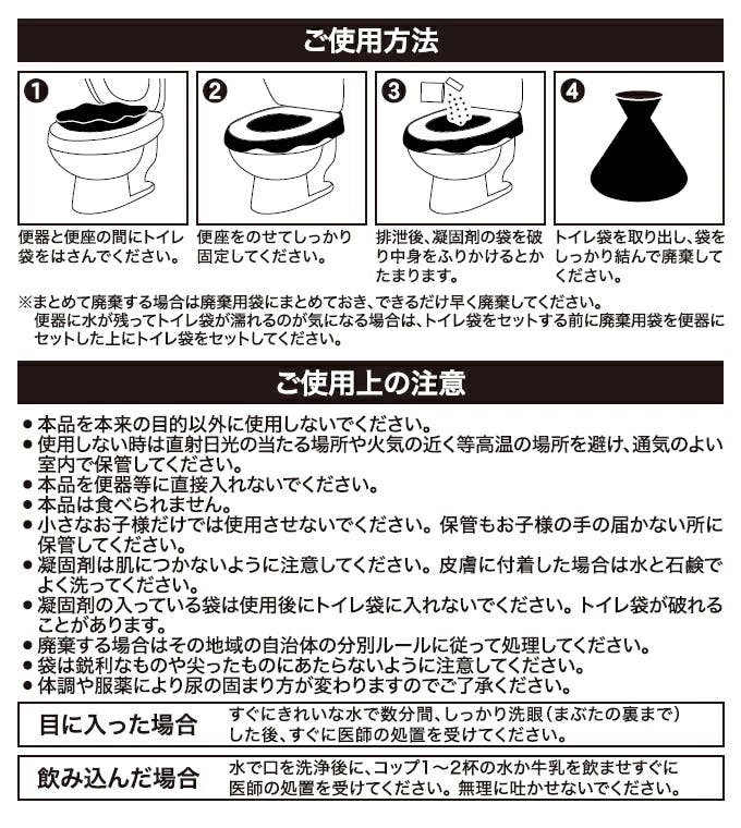 凝固・脱臭剤:抗菌吸水ポリマー、高機能活性炭トイレ袋・廃棄用袋:ポリエチレン 日本