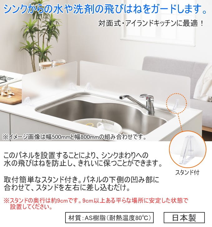 シンクからの水や洗剤の飛びはねをガードします。対面式・アイランドキッチンに最適です。取付簡単なスタンド付き。