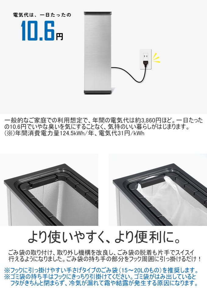 ごみ箱として以外にも、タオルを冷やしたり、お酒や化粧品を保管するなど、アイデア次第で幅広い使い方ができます。ごみ袋の取り付けも簡単。ゴミ袋の持ち手部分をフック周囲に引っ掛けるだけ。手さげタイプのごみ袋(15~20Lのもの)推奨。一般的なご家庭での利用想定で、年間の電気代は約3,860円ほど。一日たったの約10.6円で臭いを気にすることなく、気持のいい暮らしがはじまります。