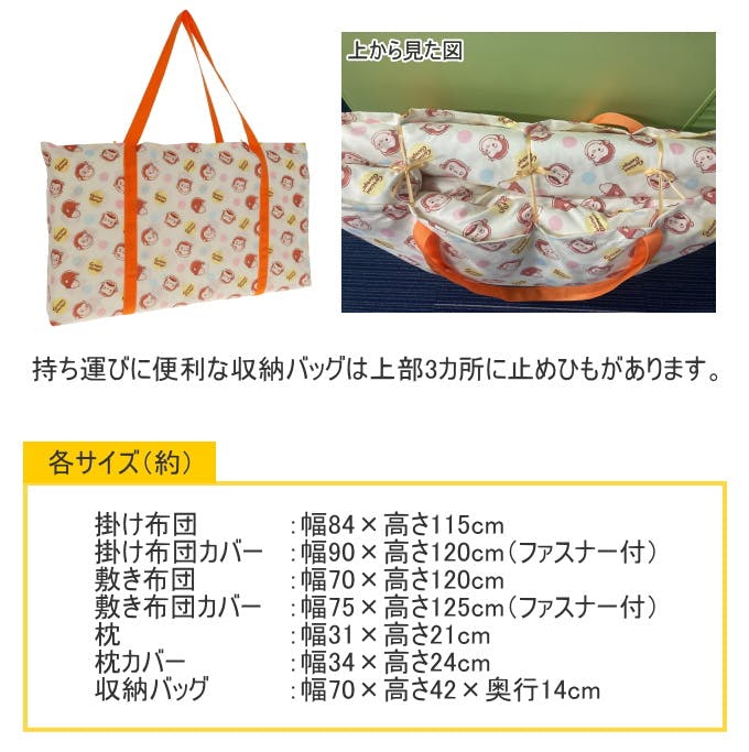■掛け布団:(約)幅84×高さ115cm■掛け布団カバー:(約)幅90×高さ120cm■敷き布団:(約)幅70×高さ120cm■敷き布団カバー(約)幅75×高さ125cm■枕:(約)幅31×高さ21cm■枕カバー:(約)幅34×高さ24cm■バッグ:(約)幅70×高さ42×奥14cm