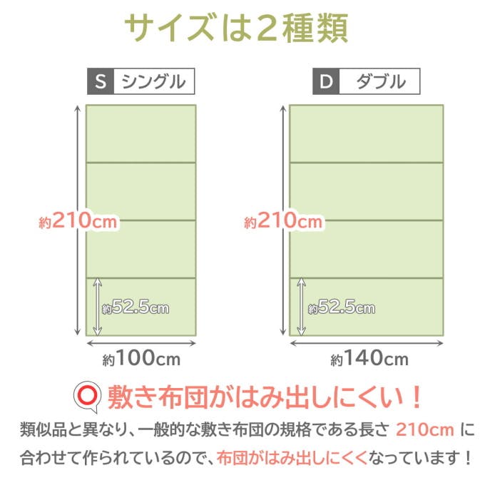 ・一般的な畳は非常に重くお部屋に固定が一般的ですが、「軽く」「コンパクト」な折りたたみマット・スはこれ一枚でマットレスやラグなど幅広い用途で使用可能です。・裏面全体に滑り止め加工が施されており、開封してすぐにお使いいただけます。