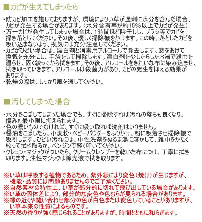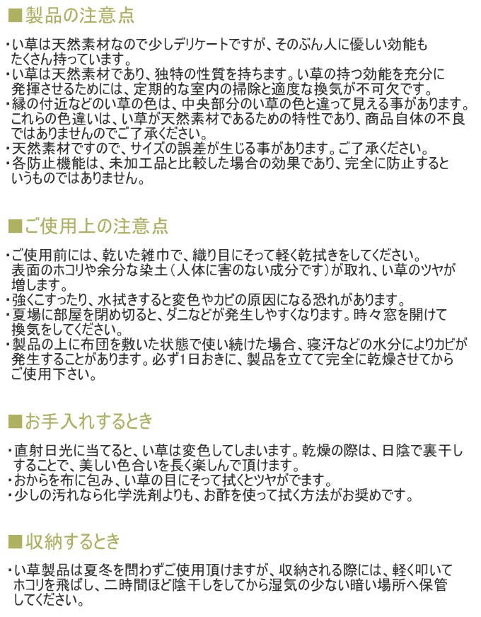 自然素材の特性上、い草が部分的に切れて飛び出している場合があります。い草の個体差により、部分的な変色や色むらが見られる場合があります。縁の近くや縫い合わせ部分の色が白色または変色していることがありますが、い草本来の性質によるものです。天然の香りが強く感じられることがありますが、時間とともに和らぎます。