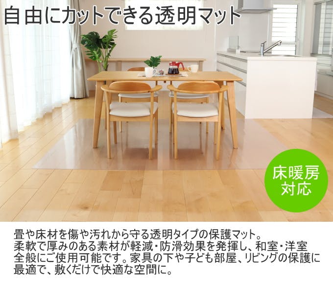 ・クリアなデザインで、フローリングやお部屋のインテリアを邪魔しません。・テーブルや椅子の動きによる傷や凹みから、床をしっかりと保護します。・裏面が床にしっかり密着し、滑りやズレを防ぎます。・角も丁寧に処理されており、めくれにくい設計。ロボット掃除機とも相性抜群です。・高温にも耐える設計で、床暖房の上でも安心して使用可能。・寒い季節にも温かさを逃さず、しっかりと床を保護します。
