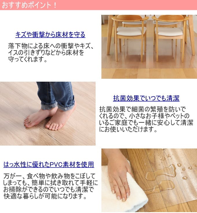 ・クリアなデザインで、フローリングやお部屋のインテリアを邪魔しません。・テーブルや椅子の動きによる傷や凹みから、床をしっかりと保護します。・裏面が床にしっかり密着し、滑りやズレを防ぎます。・角も丁寧に処理されており、めくれにくい設計。ロボット掃除機とも相性抜群です。・高温にも耐える設計で、床暖房の上でも安心して使用可能。・寒い季節にも温かさを逃さず、しっかりと床を保護します。