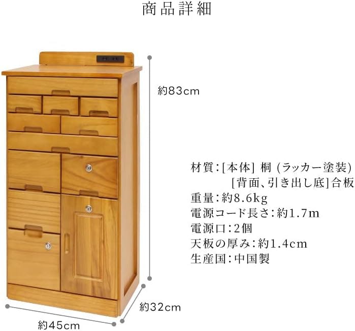 ●サイズ:約幅45×奥行32×高さ83cm●素材:桐、桐合板●備考:一部組立式(コンセント部板のみ取付)