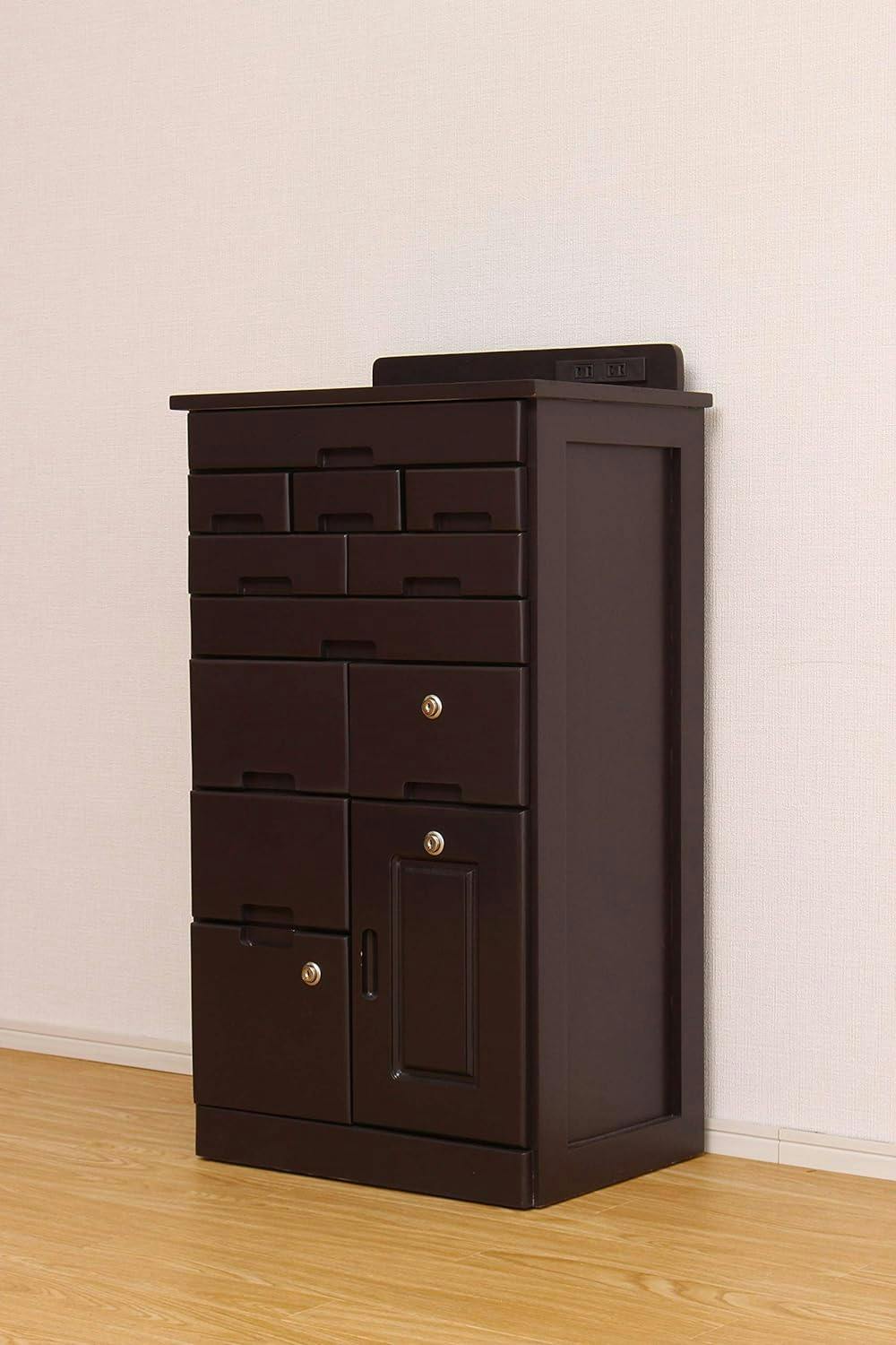 ●隠しキャスターが付いていて、楽に移動が可能。またストッパーをかけられるので、一定の場所に固定することもできます。●引き出しの一部は鍵付き!大事な書類や印鑑、年金手帳等をおしまいいただくのにオススメです。