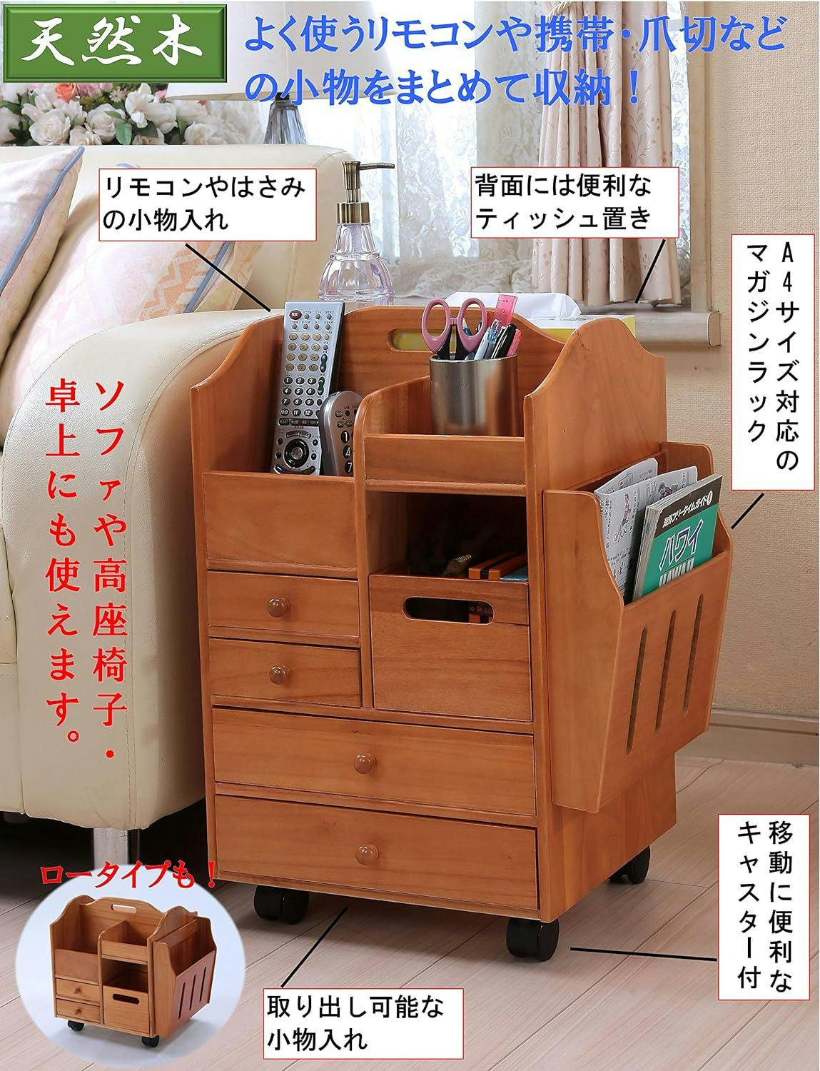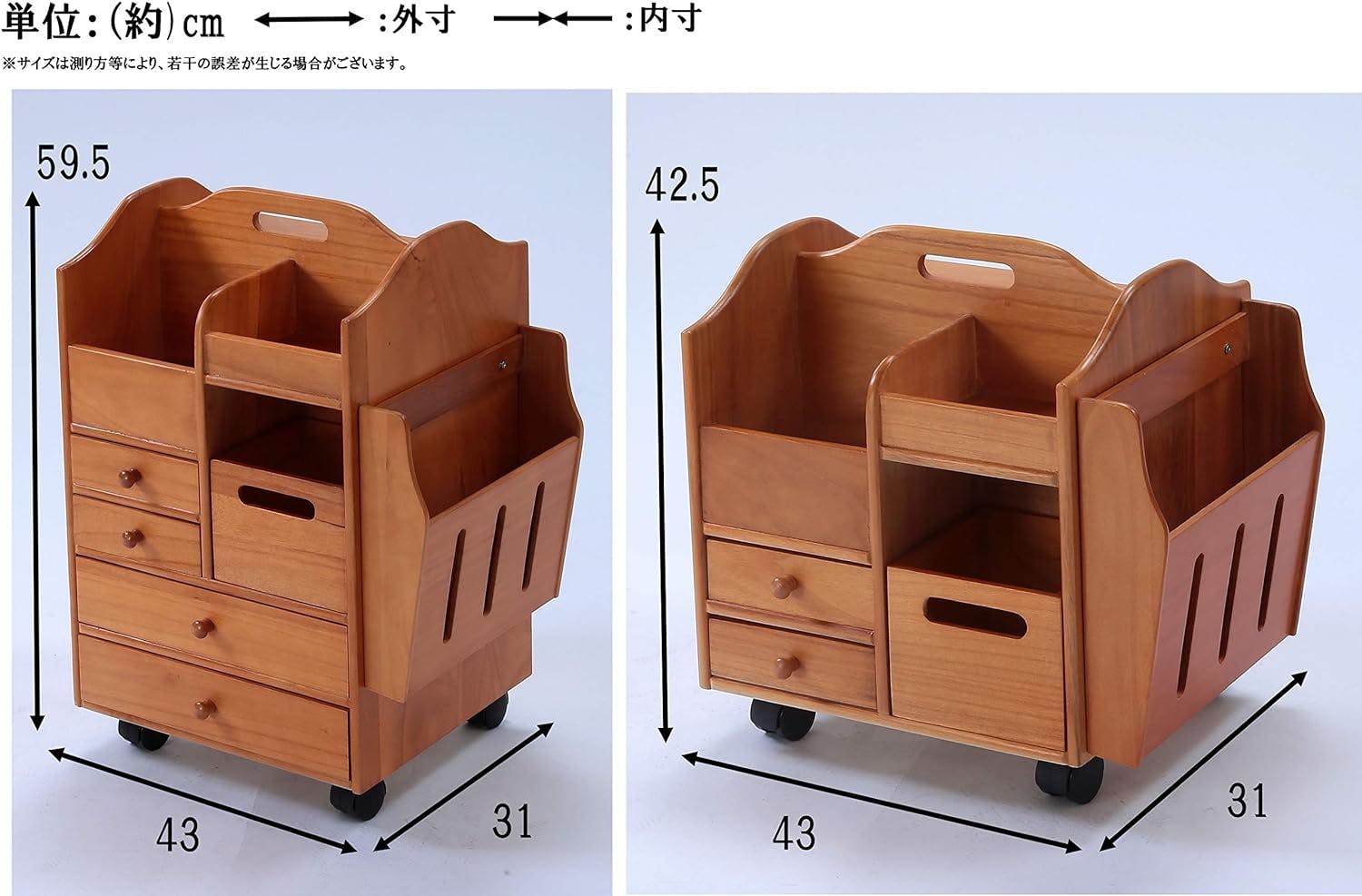 ●サイズ:幅43×奥行31×高さ42.5cm●背面内寸 下:幅32.5×奥行13×高さ20cm、上:幅32.5×奥行12.5×高さ5cm●重量:3.4kg●材質:天然木(桐・ラッカー塗装)●マガジンラック付き●キャスター付き●ティッシュ箱収納付き