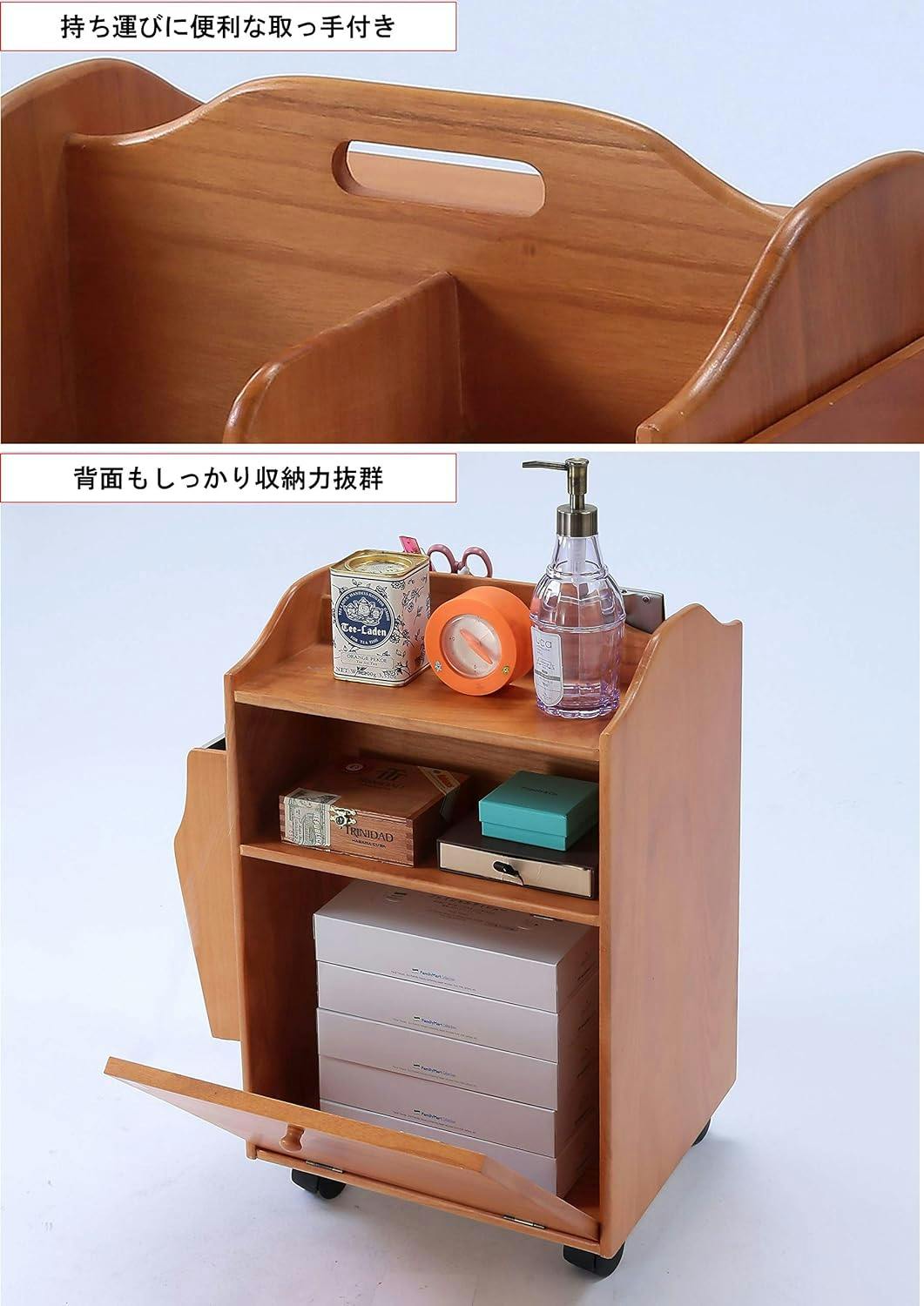 ●背面の扉を開けると、ボックスティッシュをストックできる広々としたスペースがあります。●ラクにお好きなところに移動させることができます。