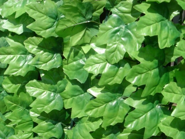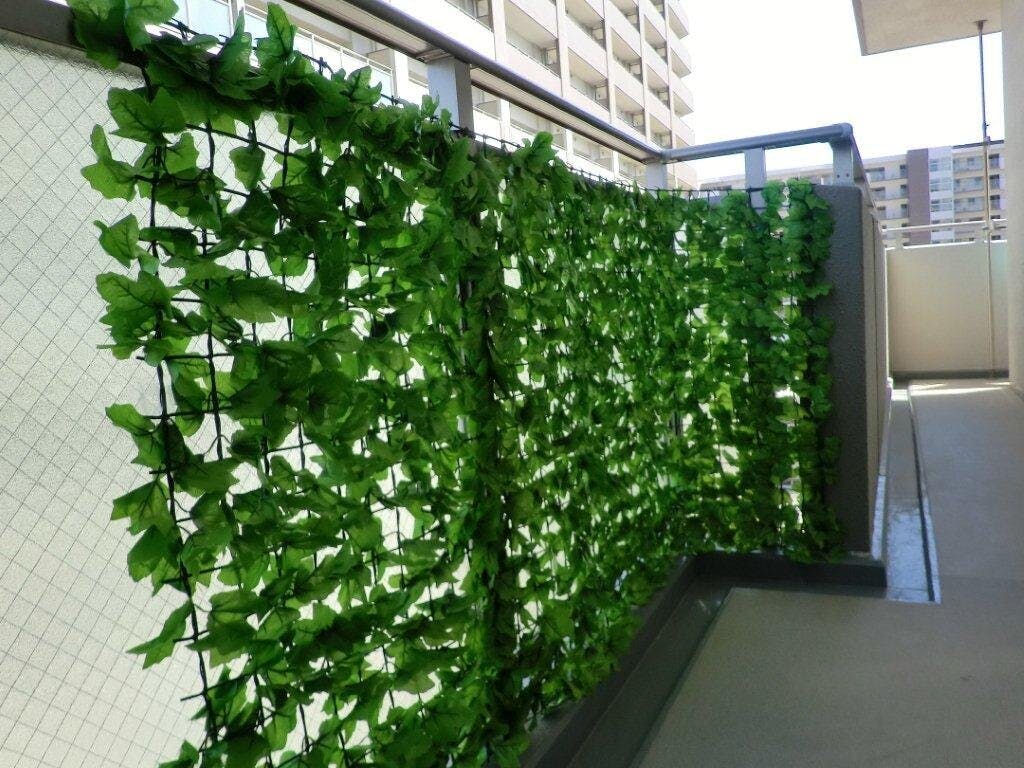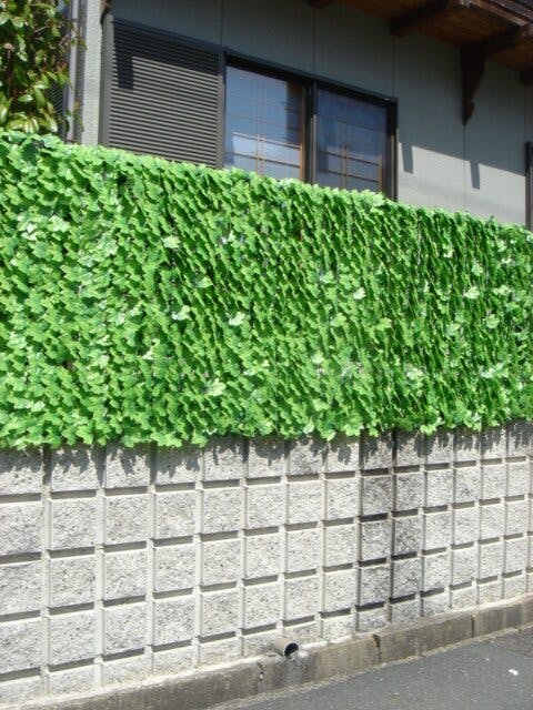 設置は、付属の結束バンドを使って、フェンスなどに括り付けるだけのグリーンフェンスです。日除けや目隠しになりますが、適度に隙間があるので風通し良好です。フェイクグリーンなのでお手入れ不要、本物の植物に比べて虫も寄り付かず安心です。