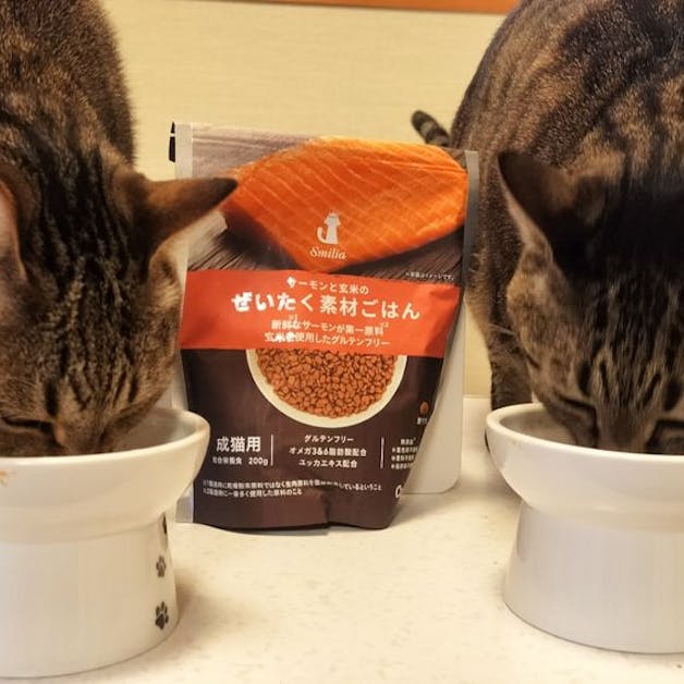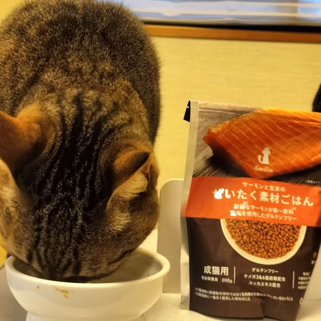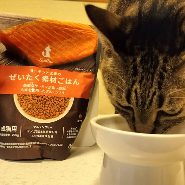 にゃん祭りに釣られて店頭で目立っていたサーモンと玄米のぜいたく素材ごはんの200gを購入しました。身体にも良さそうで、味も美味しいようで、ガツガツ美味しそうに食べてくれました。我が家のにゃんちゃんへプチ贅沢なディナーをプレゼントしました。