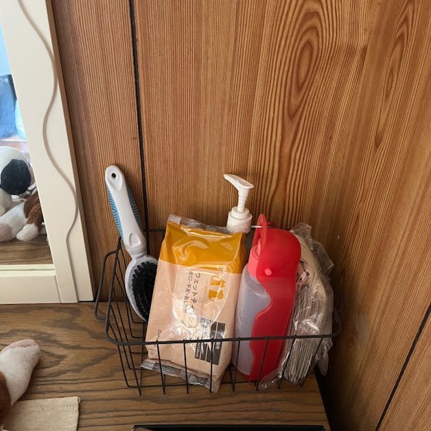 下駄箱の隅に愛犬グッズを置いてあります。散歩から帰って来たらウェットティッシュで足を拭いてあげます。以前は抱っこして洗面所で洗っていたのですごく楽になりました。たまに繋がって出てきちゃう時は顔や体を拭いてあげます。コスパ良です。