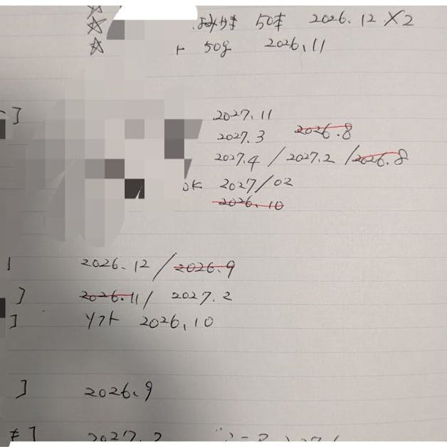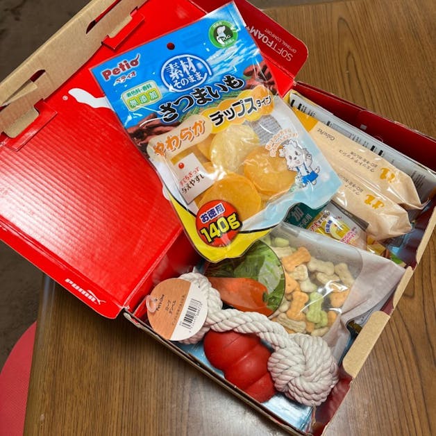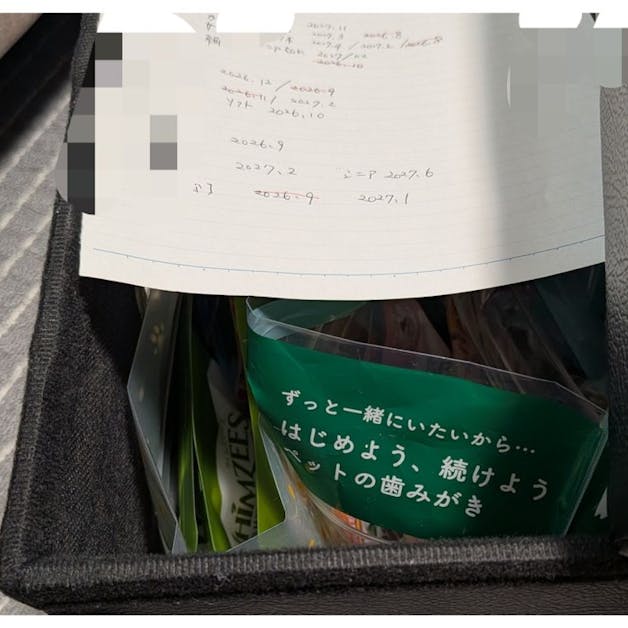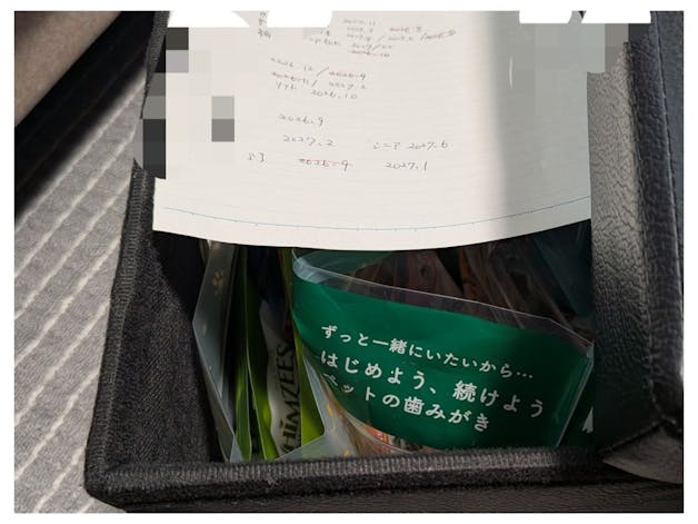 収納スツールにわんわん祭りやペットのイベント等で、沢山購入したわが子🐶のご飯やおやつの未開封品を収納しています。 賞味期限を分かりやすく、無駄がないように全部書き出して管理しています。 カテゴリー別に分けて保管もしているので、家族の誰が見てもわかるようにしました。