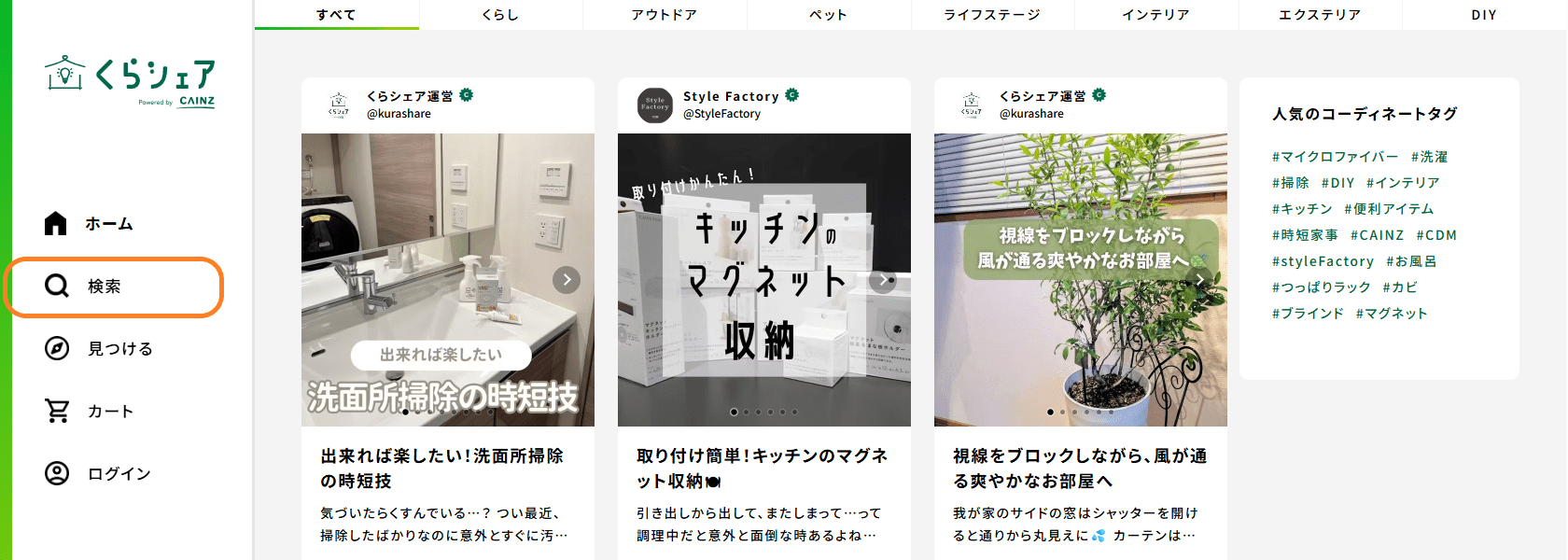 画面上部の「くらし」「アウトドア」「ペット」などを選択いただくと、そのカテゴリの新着投稿が表示されます。