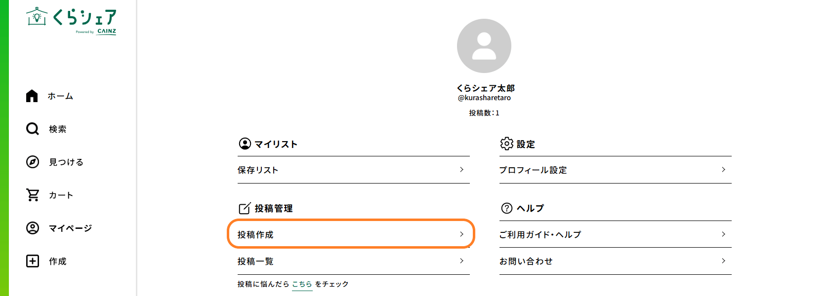 くらシェアのマイページ「投稿作成」から投稿を作成できます。画面の指示に従って、写真やコメントを入力しましょう。