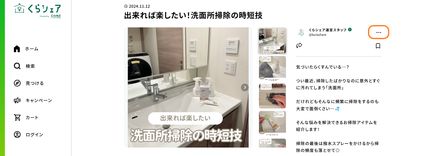 投稿詳細ページのユーザー名横の「・・・」を選択し、「問題の投稿を報告」から報告いただけます。