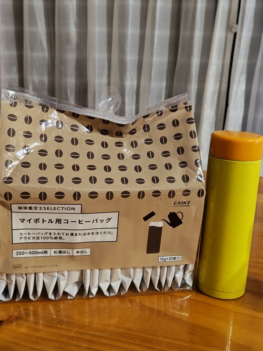 たまたま見つけたマイボトル用コーヒーバッグ 説明を見ると、パックは入れたままでOKとのこと。ズボラな私にピッタリ!お味もおいしくコーヒーを外出先で買うよりお得!!職場にお湯なしで持って行き、休憩の時にお湯を入れて10分後くらいには飲んでます。休憩の楽しみになりました。最初に買ったときはダンボールの箱入りでしたが、2個目はパック包装に!捨てるのも簡単になりました。商品リストこれで合ってるのかな!?