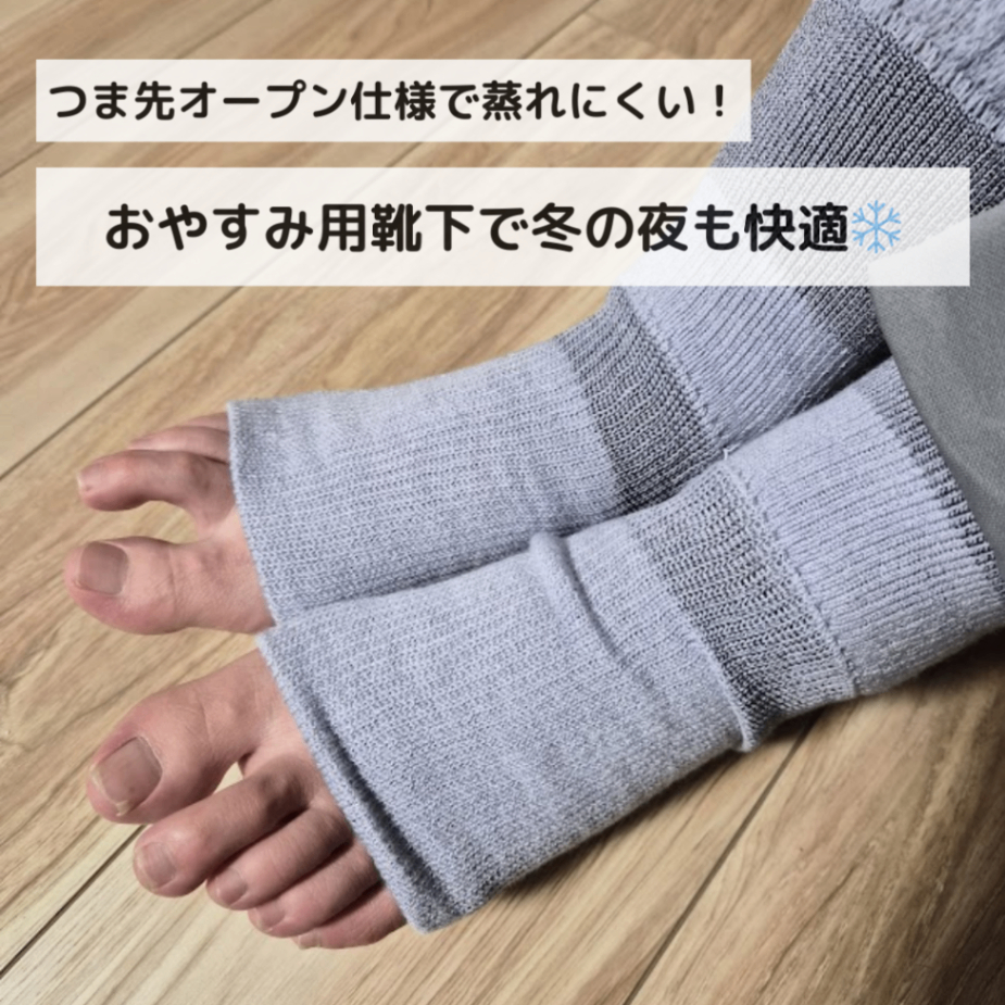 冬は寒くてスリッパを履くけど、蒸れるのが気になる…。 そんなときにちょうどいいのが、このおやすみ用靴下🧦 つま先があいているのでムレにくく、足首部分には吸湿発熱素材を使用。 ふくらはぎまでしっかりカバーもしてくれているので、 寝るときも足元がじんわり暖かったです🌞 足首とかかとがほどよくフィットしてぬげにくいのに締め付け感もなし。 気に入って洗い替え用にもう1枚購入しました🧦