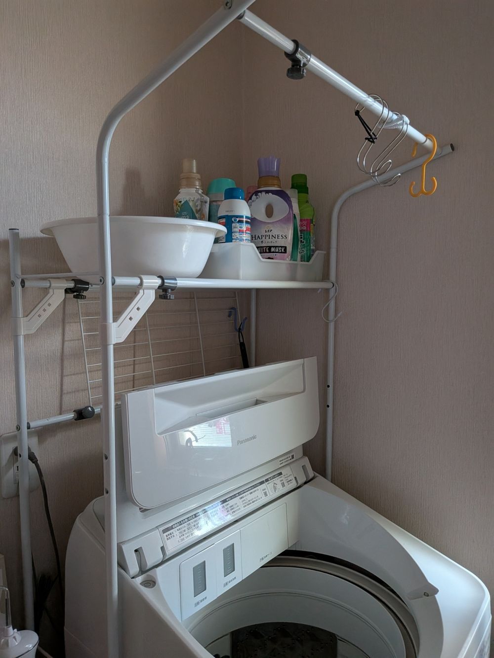 狭いスペースの有効活用に、こちらの商品を購入しました。最近洗濯パンが壊れてしまって、新しくしたら高さが出てしまって、2段目の棚があると蓋が開かなくなってしまいました。取ってしまったらガタつくかなと思ったので、前面だけ固定せずに後ろ側に預けて、物を引っ掛けて使っています。 上部ハンガーはお風呂ブーツや洗濯ピッチをかけたりと万能で、ワンアクションで洗濯できて、動作動線がとてもいいです