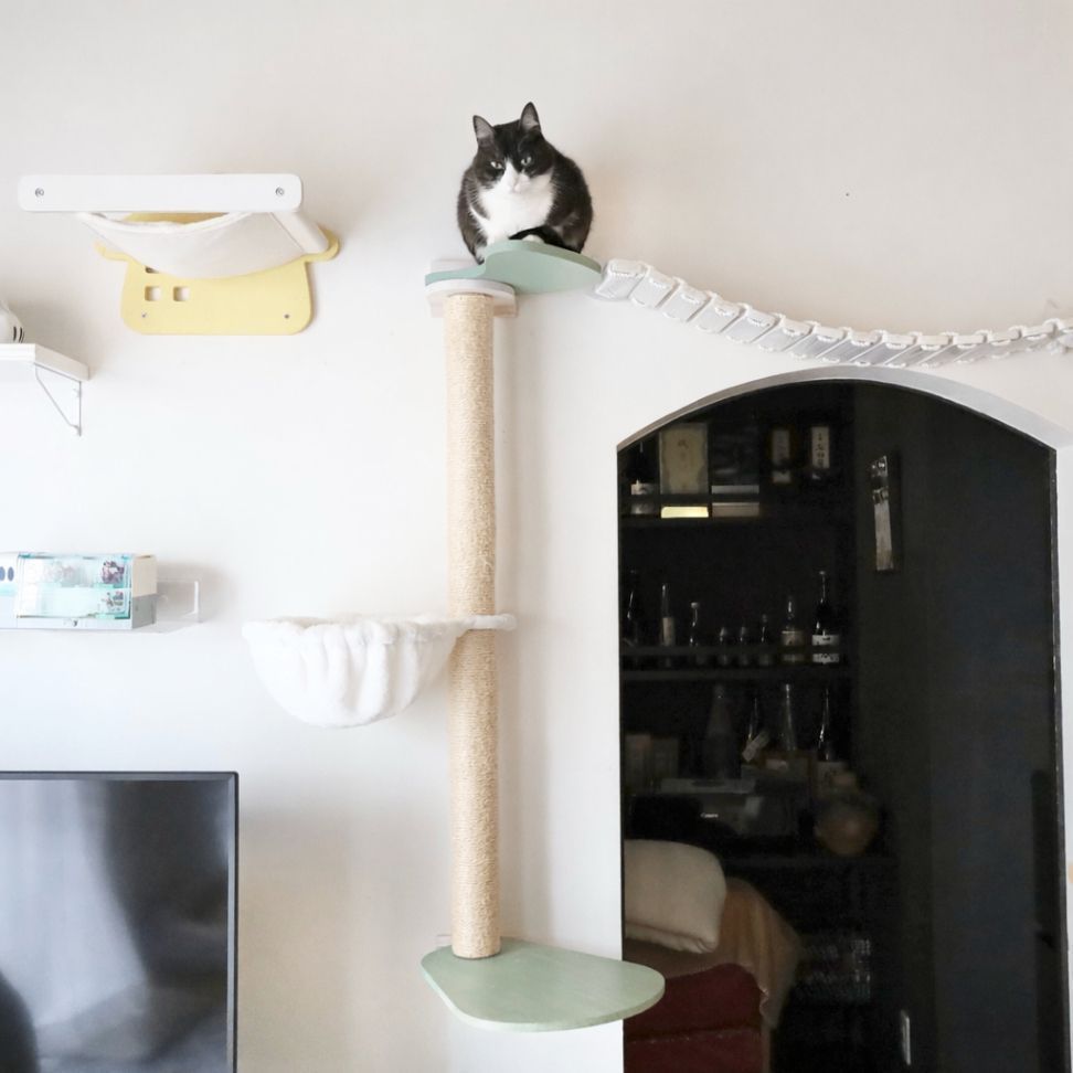 キャットタワーが壊れてしまったため、せっかくならインテリアとしても映えるキャットウォークを作りたいとDIYしました。 以前使っていたステップやハンモックはそのまま使用し、ポールなどを買い足しただけなのでそれほどお金もかからずできました。 右のハシゴは木材とロープで一から手作りしました。自分好みに可愛くできて満足です♪