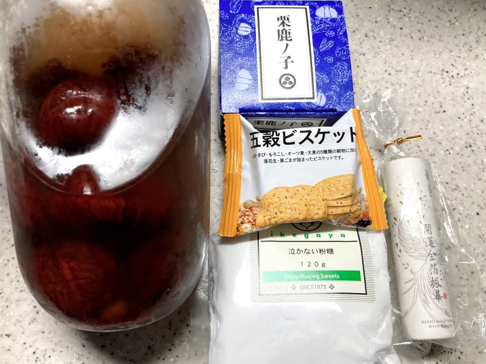 <ボトム> ・五穀ビスケット 2袋 ・バター 15g ・栗かのこ🌰 1缶 <カスタードクリーム> ※2個ですと余ります 残りは他で利用して下さい ・卵黄 1個 ・牛乳 100ml ・砂糖 大匙2 ・小麦粉 大匙1 弱 ・ラム酒 適量